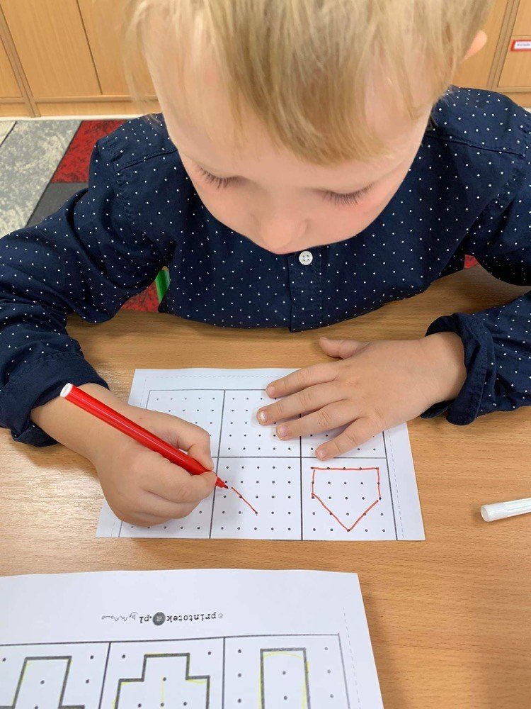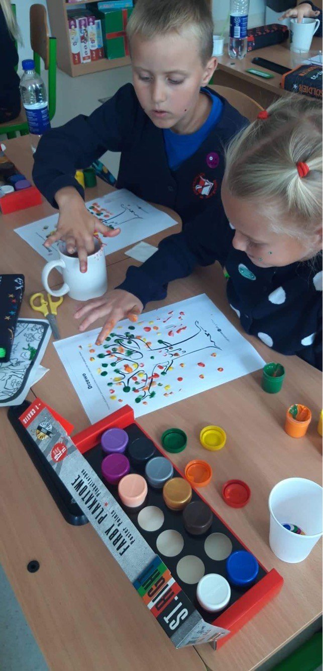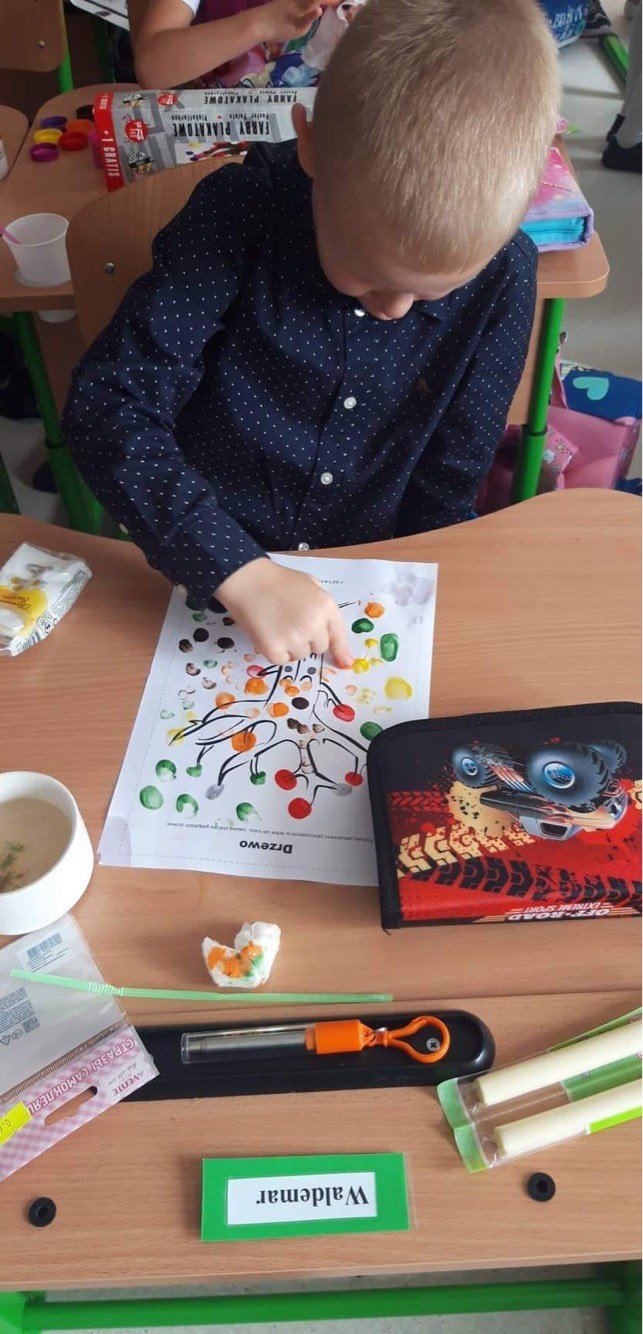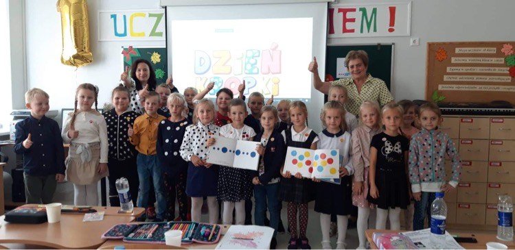 Klasa 1b również świętowała ten Dzień. Motywem przewodnim na wszystkich lekcjach była oczywiście Kropka . Uczniowie odświętnie się ubrali w kropkowe stroje. Na matematyce dzieci rysowały kropkowe figury, na języku polskim łączyły kropkowe literki , na języku litewskim przyklejały kropkowe samogłoski, piękne i pomysłowe prace kropkowe powstały na lekcji plastyki , nie zabrakło również zabaw w szukanie kropek, ustawianie się na kropkach czy też łapanie kropek . Logopeda Iwona Krajewska przeprowadziła zajęcie logopedyczne oczywiście z kropkami, dzieci wykonały ćwiczenia artykulacyjne i oddechowe za pomocą kropek .Największą radość sprawiła zabawa z interaktywną książeczką Herve Tulleta ” Naciśnij mnie”. Dzieci kropki naciskały, liczyły, uderzały, śpiewały ciche i głośne dźwięki, zdmuchiwały, zapamiętywały, zamieniały w coś innego.