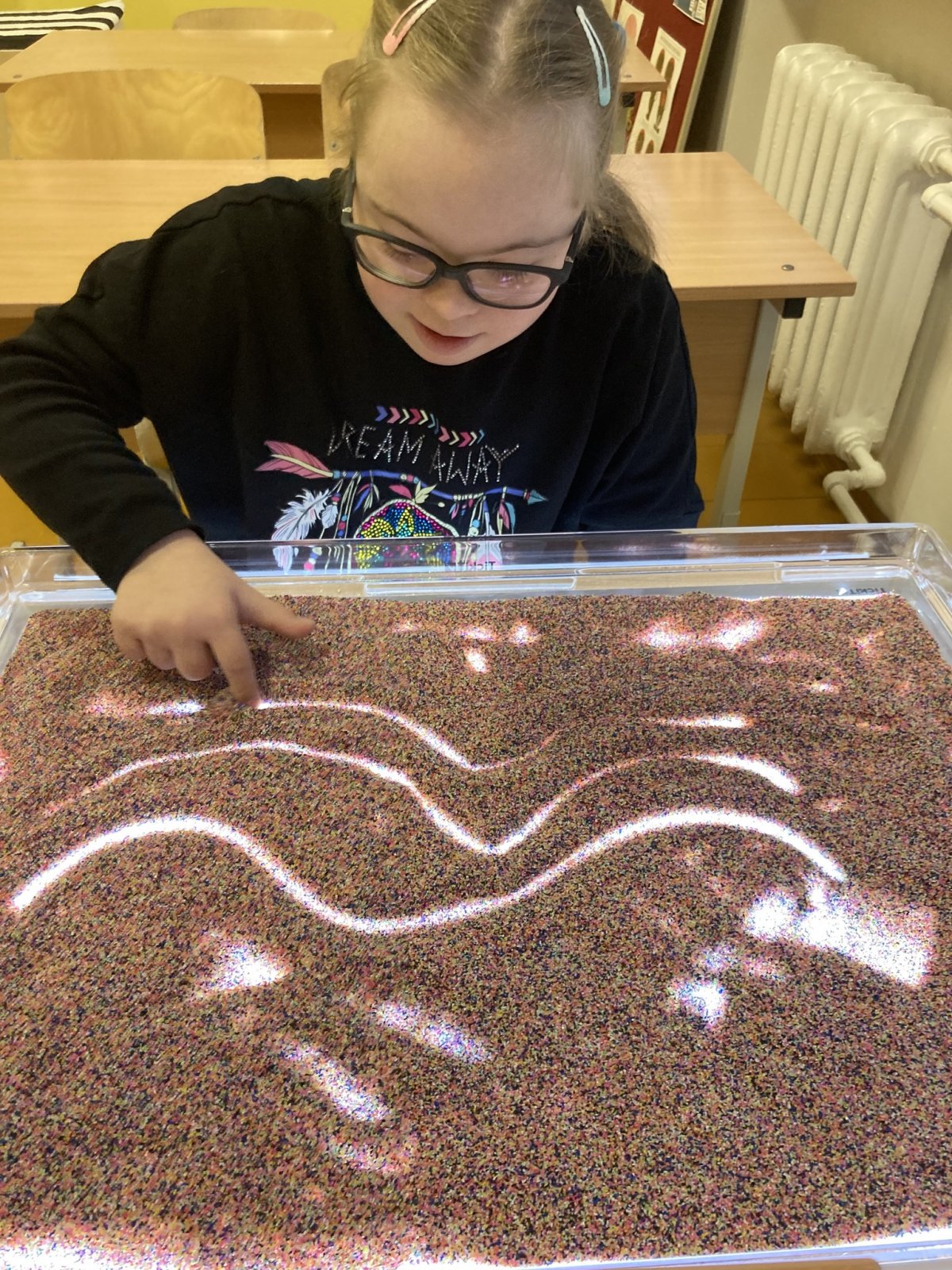 Gabinet został wyposażony również w wielofunkcyjny panel świetlny. Światło odgrywa istotną rolę w procesie uczenia się - wzbudza ciekawość uczniów, stymuluje zmysł wzroku, pomaga rozwinąć funkcje poznawcze. Taka terapia światłem doskonale angażuje dziecko w proces uczenia się, uczniowie za pomocą ćwiczeń rozwijają motorykę małą, ćwiczą umiejętność pisania i liczenia, uczą się kolorów i kształtów, światło wpływa też uspakajająco na dzieci, pomaga skupić się i wyciszyć.