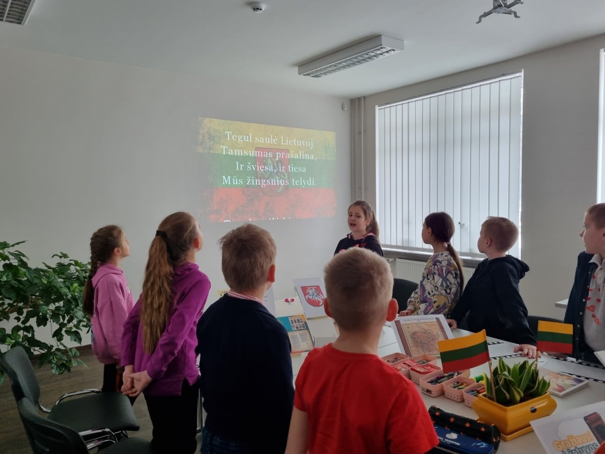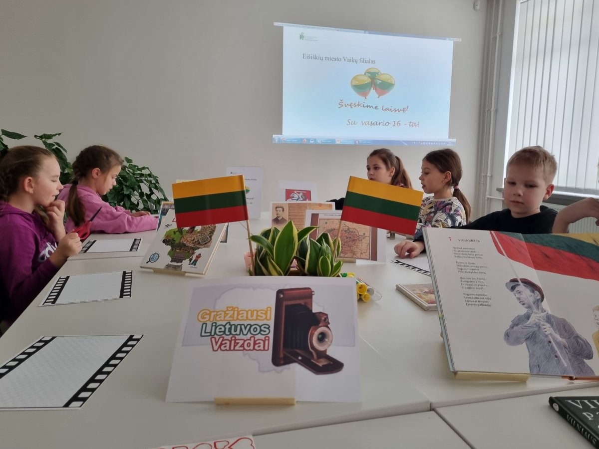 Vaikai iškilmingai giedojo valstybės himną, "keliavo" po savo rajoną, skaitė nuostabias eiles apie Lietuvą, atliko kūrybinį darbą. Vaikų darbeliai papuoš bibliotekos patalpą.