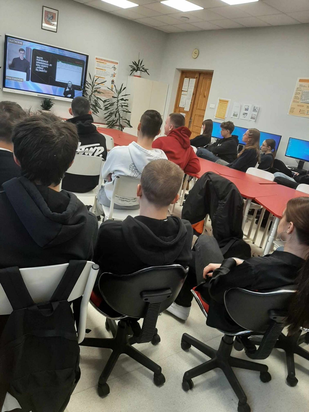 • 11-12 klasių mokiniai išklausė su patyrusiais lektoriais aktualias karščiausias skaitmeninio pasaulio naujienas, sužinojo, kaip išvengti tykančių pavojų ir atsakingai elgtis internete, geriau suprato dirbtinį intelektą, sužinojo apie skaitmeninę detoksikaciją, ateities technologijas paskaitoje: „DIRBTINIS INTELEKTAS IR MES, ŽMONĖS: BIJOTI, NAUDOTI,DRAUGAUTI?“