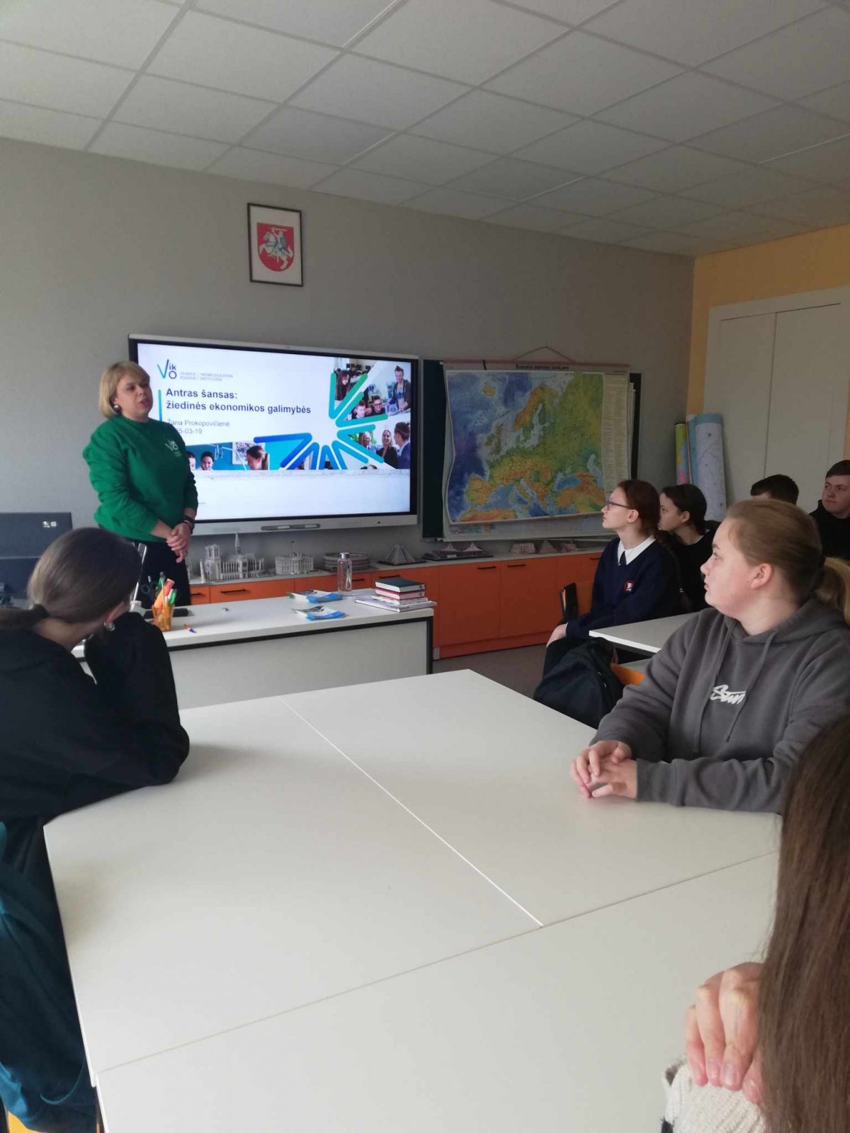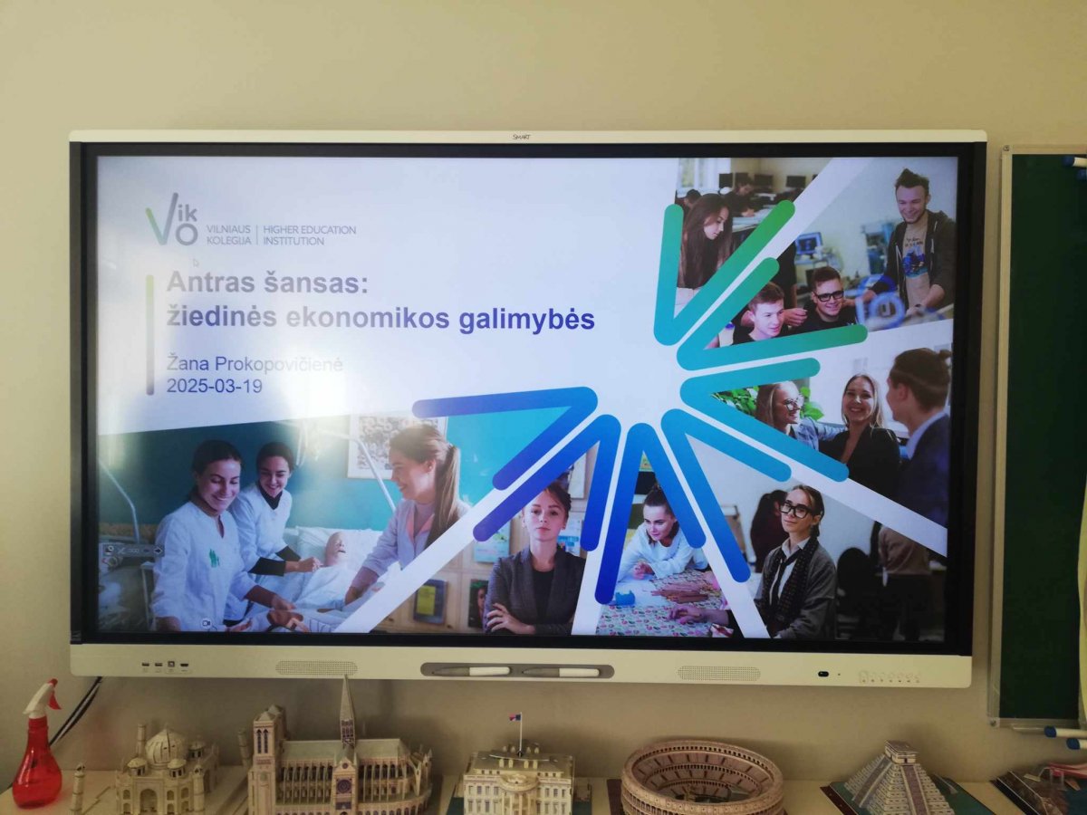 Kovo 18-ą dieną, mūsų gimnazijos I, II ir IV-os klasių mokiniai, dalyvavo netradicinėje geografijos pamokoje, tema: "Antras šansas: žiedinės ekonomikos galimybės" . Pamoką vedė Vilniaus Kolegijos lektorė Žana Prokopovičienė. Pamokoje buvo kalbėta apie žiedinės ekonomikos svarbą ir kuo ši ekonomikos sistema naudinga. Mokiniai sužinojo, kad žiedinė ekonomika suteikia naują konkurencinį pranašumą, mažina išteklių poreikį, energijos suvartojimą ir taršą anglies dioksidu.