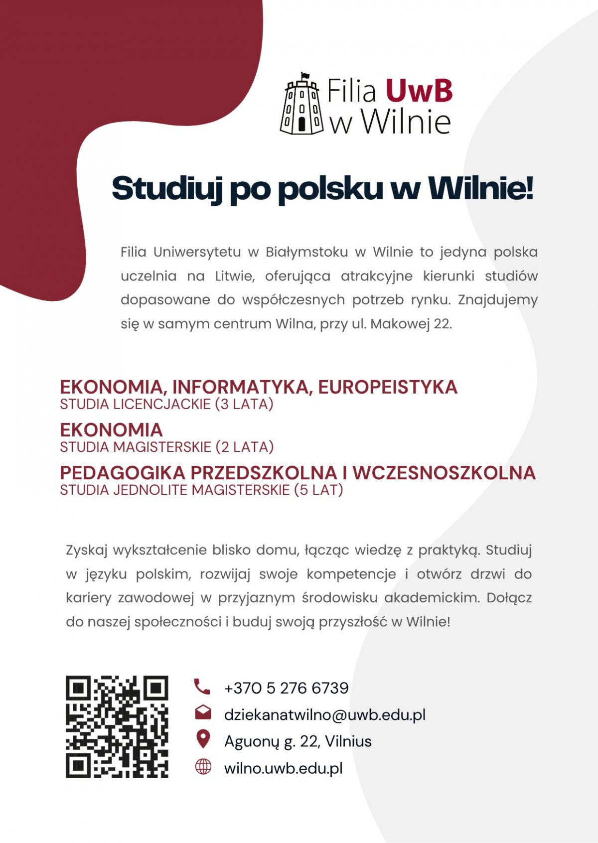 Filia Uniwersytetu w Białymstoku w Wilnie to wyjątkowe miejsce na edukacyjnej mapie Europy – jedyna zagraniczna jednostka polskiego uniwersytetu oraz jedyna polska uczelnia wyższa działająca na Litwie. Oferuje wysokiej jakości studia akademickie w języku polskim, prowadzone w przyjaznym, międzynarodowym środowisku.