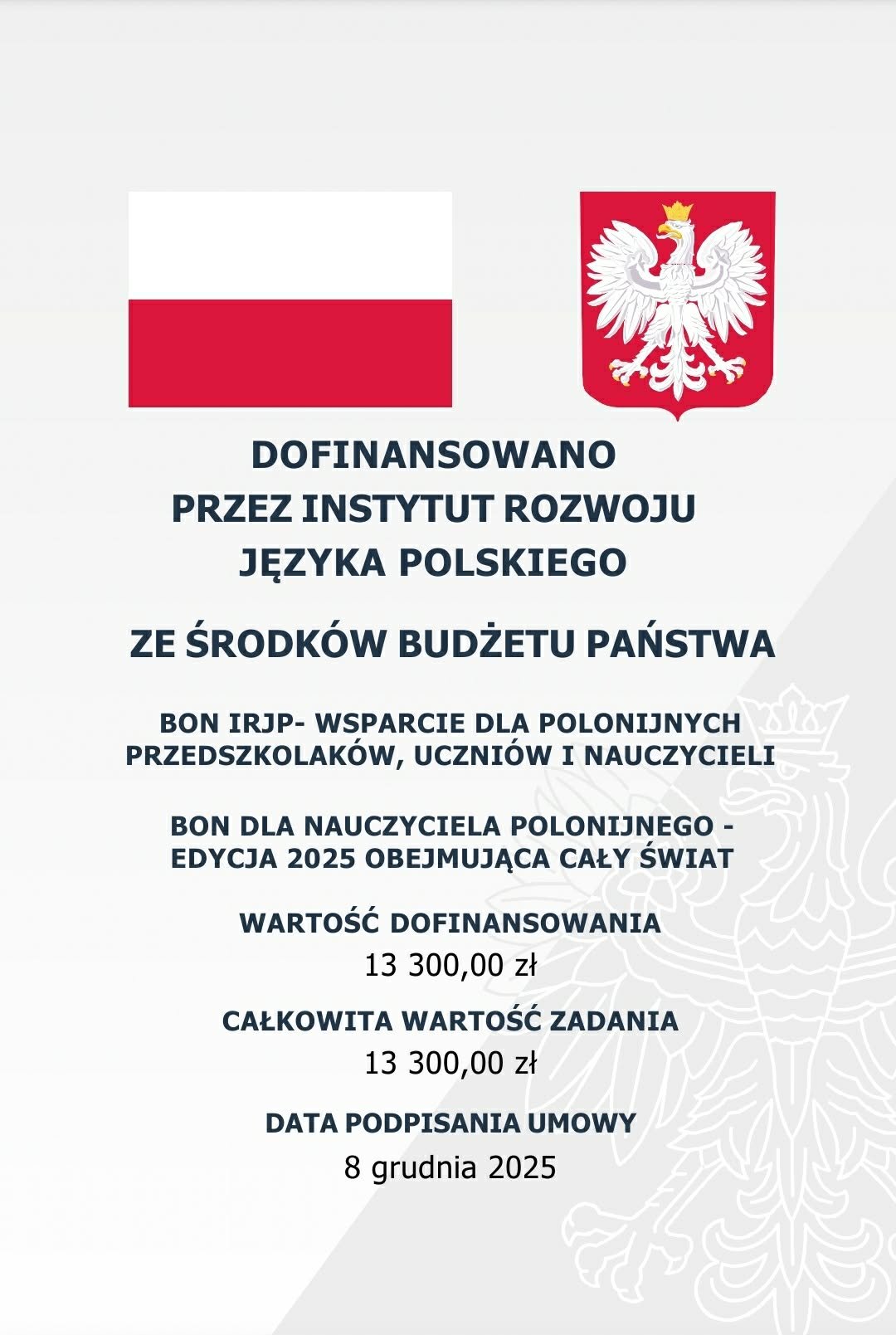 Informujemy, że w ramach programu „Bon dla nauczyciela polonijnego – edycja 2025 obejmująca cały świat”, realizowanego przy wsparciu Instytutu Rozwoju Języka Polskiego im. św. Maksymiliana Marii Kolbego, 14 nauczycieli naszego gimnazjum otrzymało wsparcie finansowe w łącznej wysokości 13300,00 zł.
