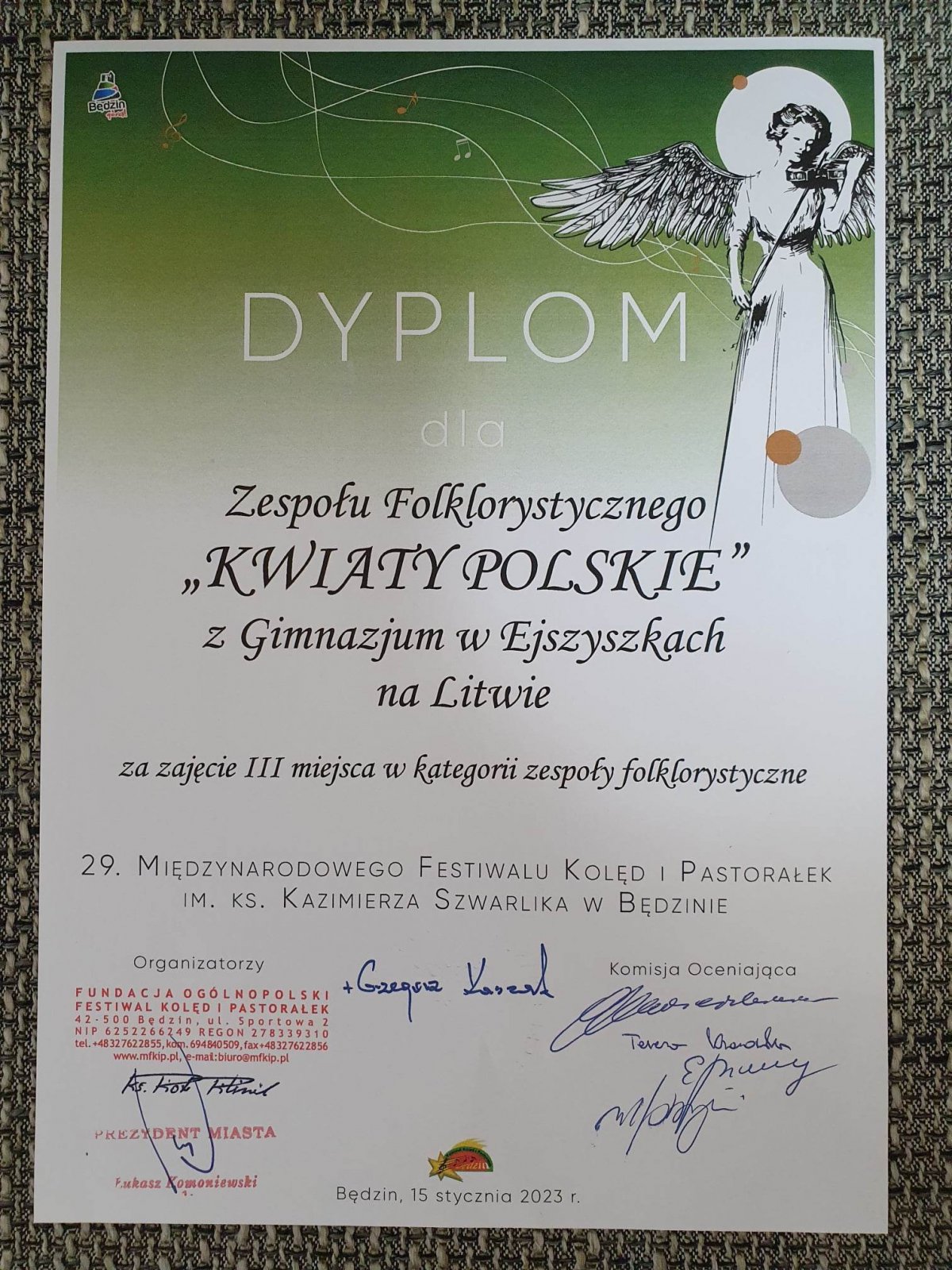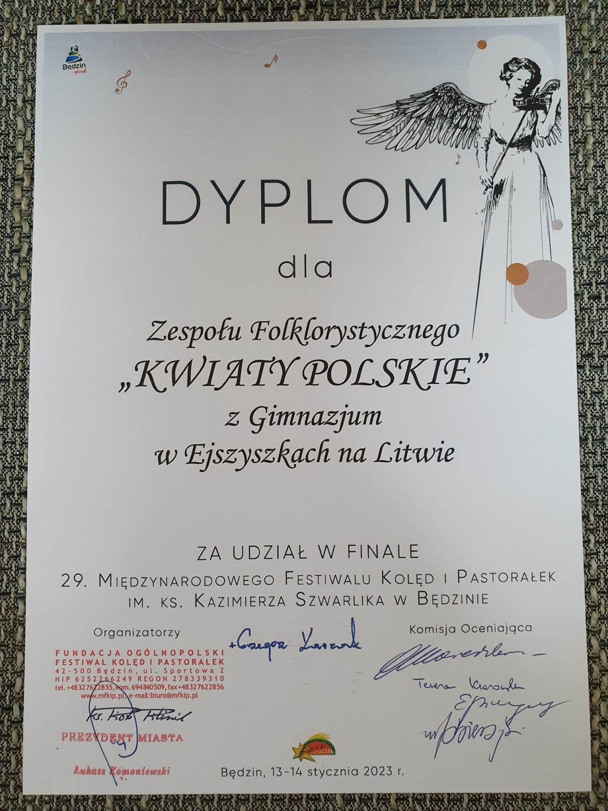 W dniach 13-16 stycznia 2023 roku uczestnicy Folklorystycznego Zespołu „Kwiaty Polskie” wzięli udział w Międzynarodowym Festiwalu Kolęd i Pastorałek im. ks. Kazimierza Szwarlika w Będzinie w Polsce. Jeszcze raz gratulujemy i składamy wyrazy uznania z okazji zdobycia III miejsca w kategorii „zespoły folklorystyczne”! Gratulacje składamy również kierowniczce „Kwiatów Polskich” pani Bożenie Czenko, która zajęła III miejsce w kategorii „soliści”.