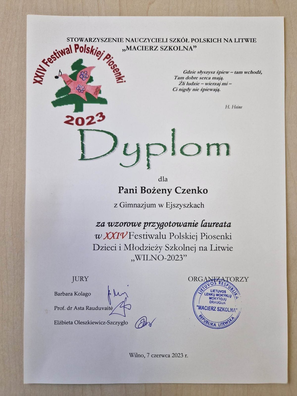 7 czerwca 2023 roku w Domu Kultury Polskiej w Wilnie odbył się XXIV Festiwal Polskiej Piosenki Dzieci i Młodzieży Szkolnej na Litwie „Wilno–2023”. W tym roku w festiwalu udział wzięło 53 uczestników. Nasze gimnazjum dostojnie reprezentowali: Faustyna Czenko, Karina Lubkiewicz i Tomasz Suckiel.