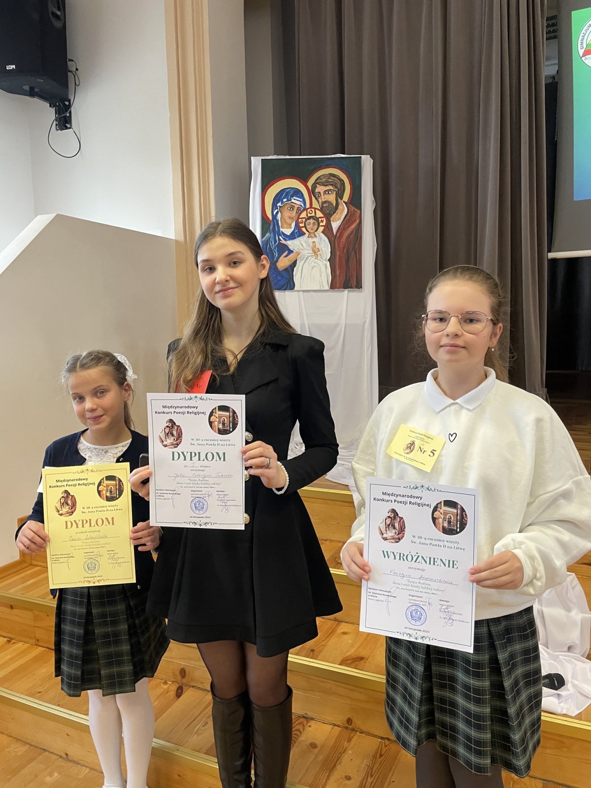 24 listopada br. uczennice naszego gimnazjum wzięły udział w Konkursie Poezji Religijnej w Gimnazjum im. Sz. Konarskiego w Wilnie, który w tym roku odbywał się pod hasłem: „Święta Rodzina - ikona i wzór każdej ludzkiej rodziny”. Wszyscy uczestnicy otrzymali dyplomy za udział i prezenty.