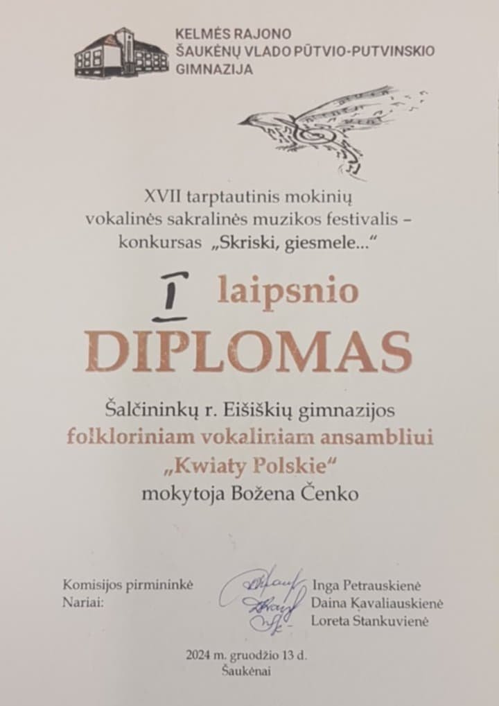 Sveikiname Eišiškių gimnazijos solistus ir folklorinį ansamblį „Kwiaty Polskie“ gavus aukštus įvertinimus. Džiaugiamės ir didžiuojamės.