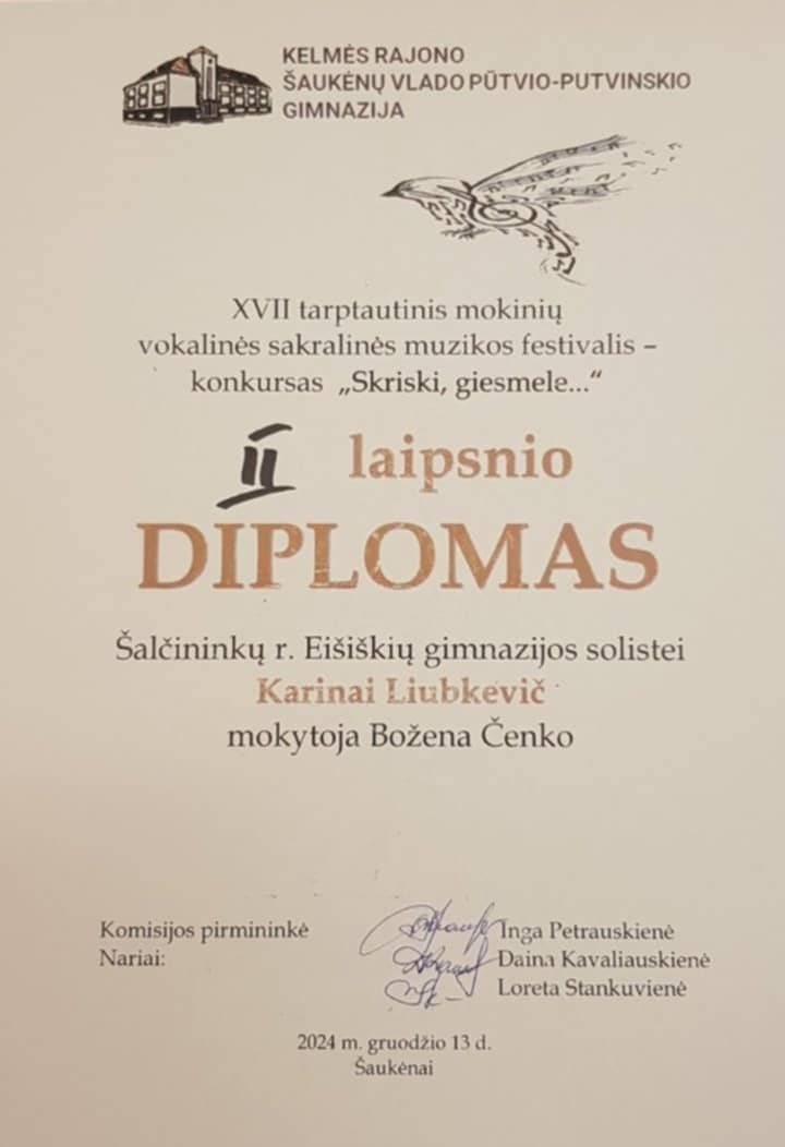 Sveikiname solistus ir folklorinį ansamblį už Eišiškių gimnazijos atstovavimą tarptautiniame konkurse. Ačiū dainininkus paruošusiai mokytojai Boženai Čenko ir mokytojai Alicijai Turovskai už gražų dalyvių įvaizdį.
