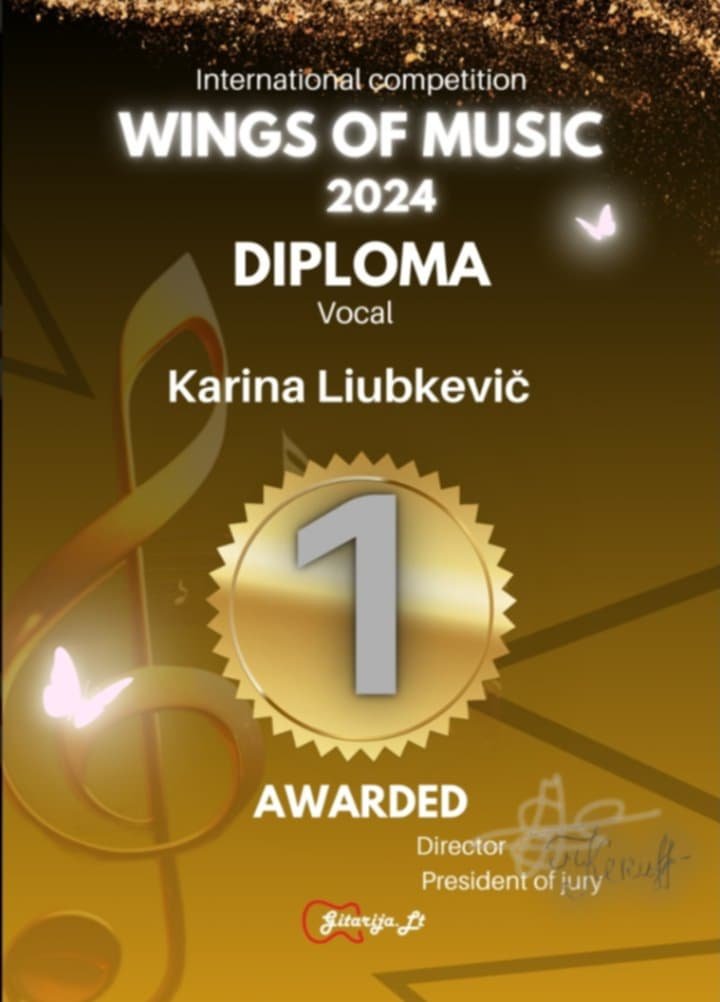 Atkeliavo džiugios naujienos iš Tarptautinio vokalistų ir instrumentalistų konkurso „Wings of music 2024“, kuriame dalyvavo ir C kategorijoje laimėjo I vietos diplomą ir nominaciją „Muzikaliausia atlikėja“ mūsų gimnazijos 6a klasės mokinė Karina Liubkevič. Nuotolinis konkursas sulaukė net 270 dalyvių iš įvairių šalių.