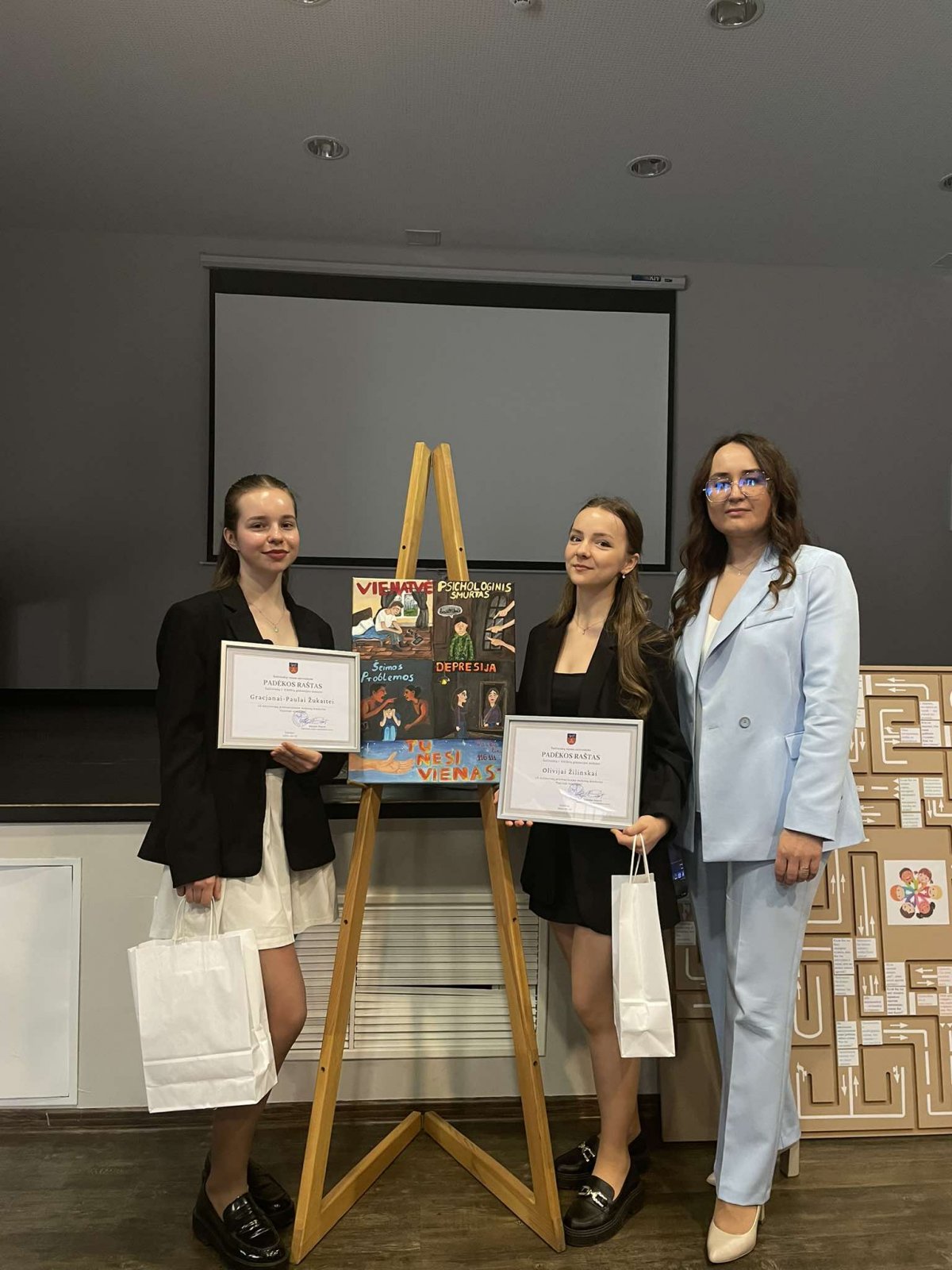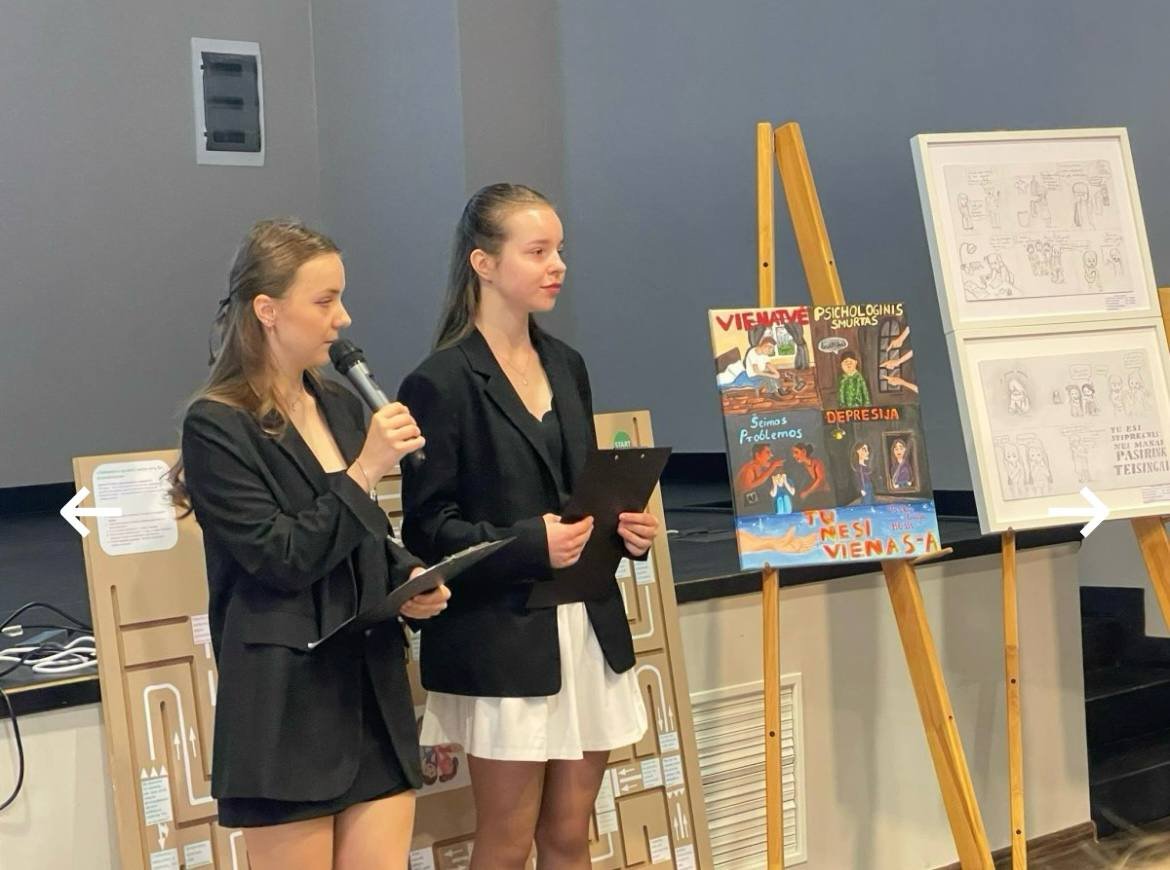 Mokinės parengė piešinį pavadinimų "Balsas tyloje", atspindintį emocinės tylos skausmą ir vidinę kovą, su kuria gali susidurti žmogus. Piešiniu siekėme perteikti žinutę, kad svarbu išgirsti net ir tyliausius pagalbos šauksmus bei skatinti kalbėjimąsi apie psichinę sveikatą. Ši patirtis buvo jautri, bet labai prasminga – ji padėjo geriau suprasti emocinę paramą ir empatiją.