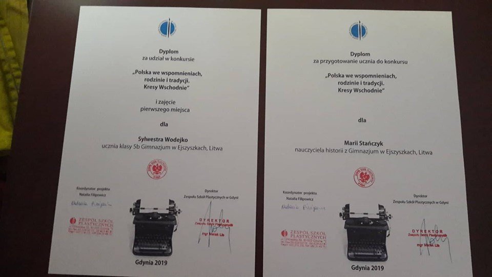 Fotorelacje z pobytu naszego ucznia Sylwestra Wodejki w Polsce. Wyjazd był nagrodą za zdobycie pierwszego miejsca w konkursie historycznym "Polska we wspomnieniach, rodzinie i tradycji. Kresy Wschodnie". Uroczystość wręczenia dyplomów odbyła się w Domku Żeromskiego w Gdyni. Dyplom dziękczynny został przekazany też nauczycielce historii p. Marii Stańczyk, która przygotowywała ucznia do konkursu.