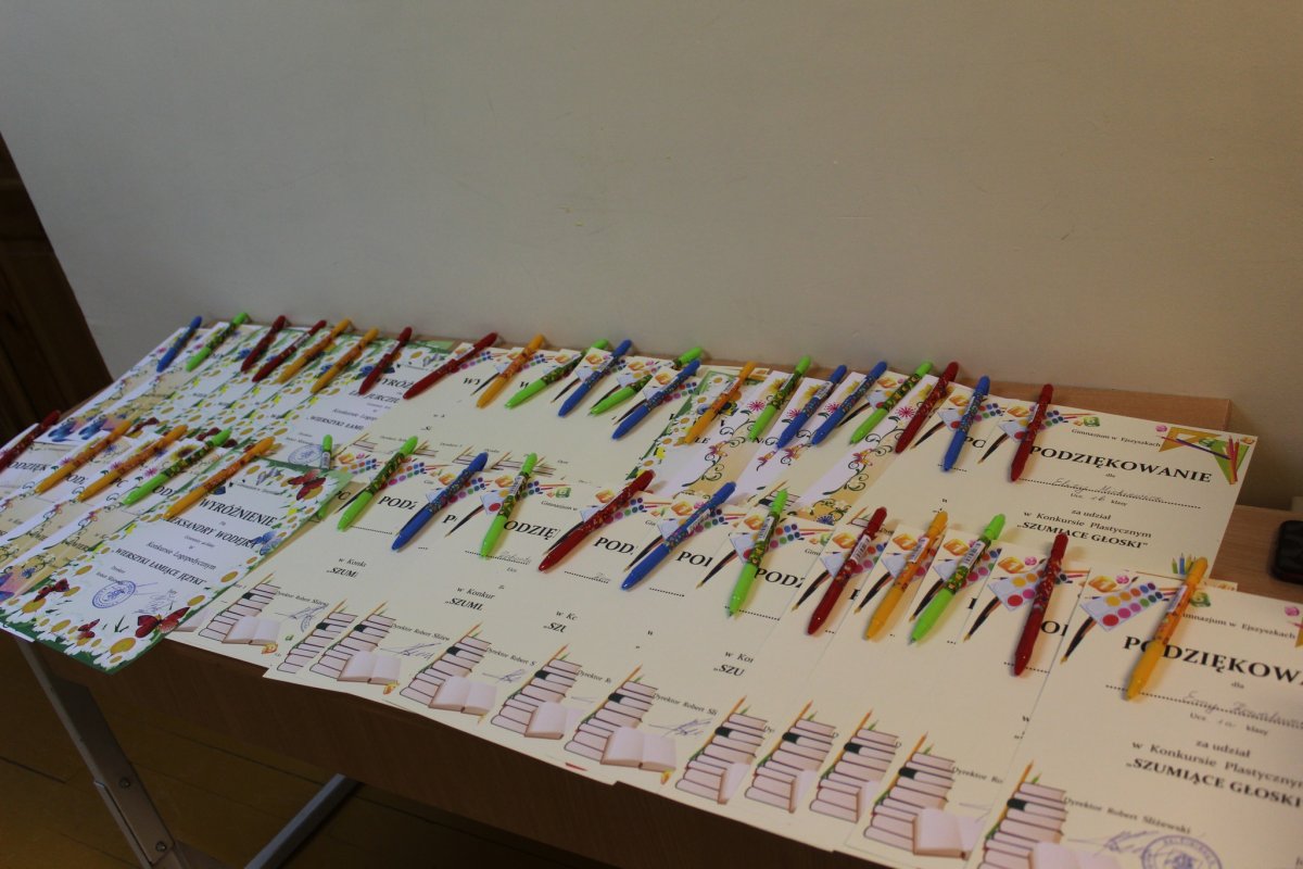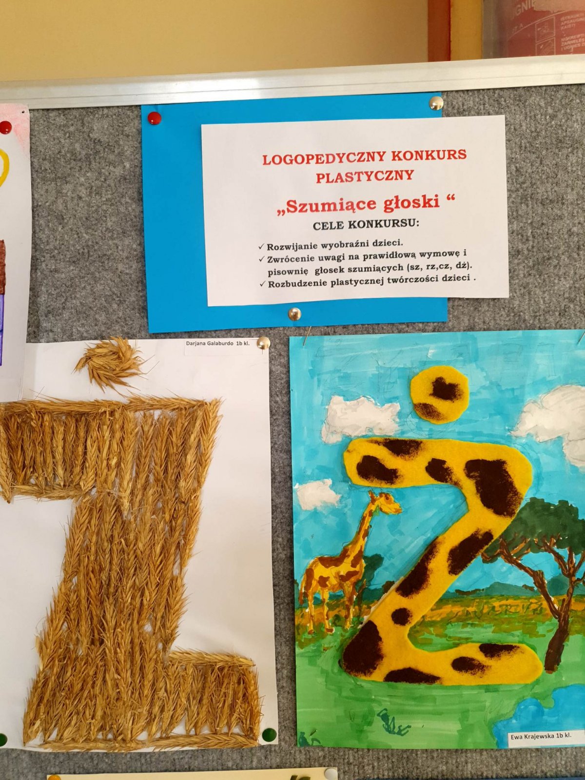 W ramach obchodów Europejskiego Dnia Logopedy w marcu uczniowie klas 1-ych wzięli udział w konkursie plastycznym „Szumiące głoski“. Zadaniem uczestników było za pomocą różnych technik plastycznych zaprezentować głoski szumiące języka polskiego. Każda praca była wyjątkowa i niepowtarzalna, trudno było wyłonić kilka prac , więc jury postanowiło wyróżnić wszystkie prace najbardziej kreatywne i pomysłowe. Jury w składzie wicedyrektor Gimnazjum p. Alicji Jankiewicz, koordynator do spraw pozalekcyjnych p. Marzeny Juchniewicz oraz logopedy Iwony Krajewskiej wyróżniło prace następujących uczniów:
