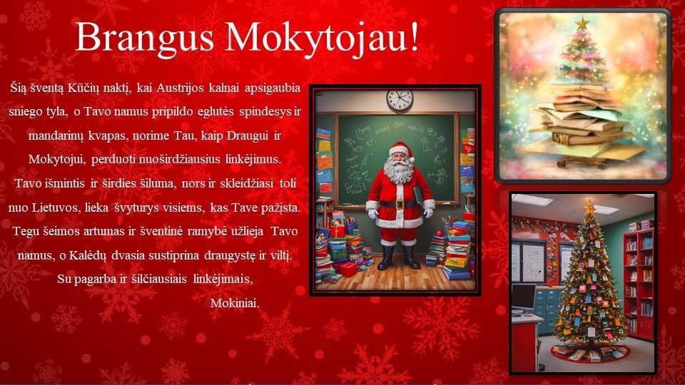 2024 m. gruodžio 6 d. – 2025 sausio 3 d. mūsų gimnazijos mokiniai dalyvavo respublikiniame skaitmeninių piešinių, sukurtų su dirbtinio intelekto programomis konkurse. Šio konkurso tikslas – skatinti mokinių kūrybišką naujausių išmaniųjų technologijų pažinimą ir taikymą, pasitelkus dirbtinio intelekto įrankius skaitmeninio piešinio kūrimui. Pirmajame tokio pobūdžio konkurse piešiniams kurti mokiniai panaudojo įvairias DI programas, generuojančias tekstą ir vaizdą iš teksto: Leonardo.ai, ImageGen, Midjourney, ChatGPT, DALL-E, Fusionbrain.ai, Magicstudio, Open.ai, Craiyon, DeepAi ir kitas.
