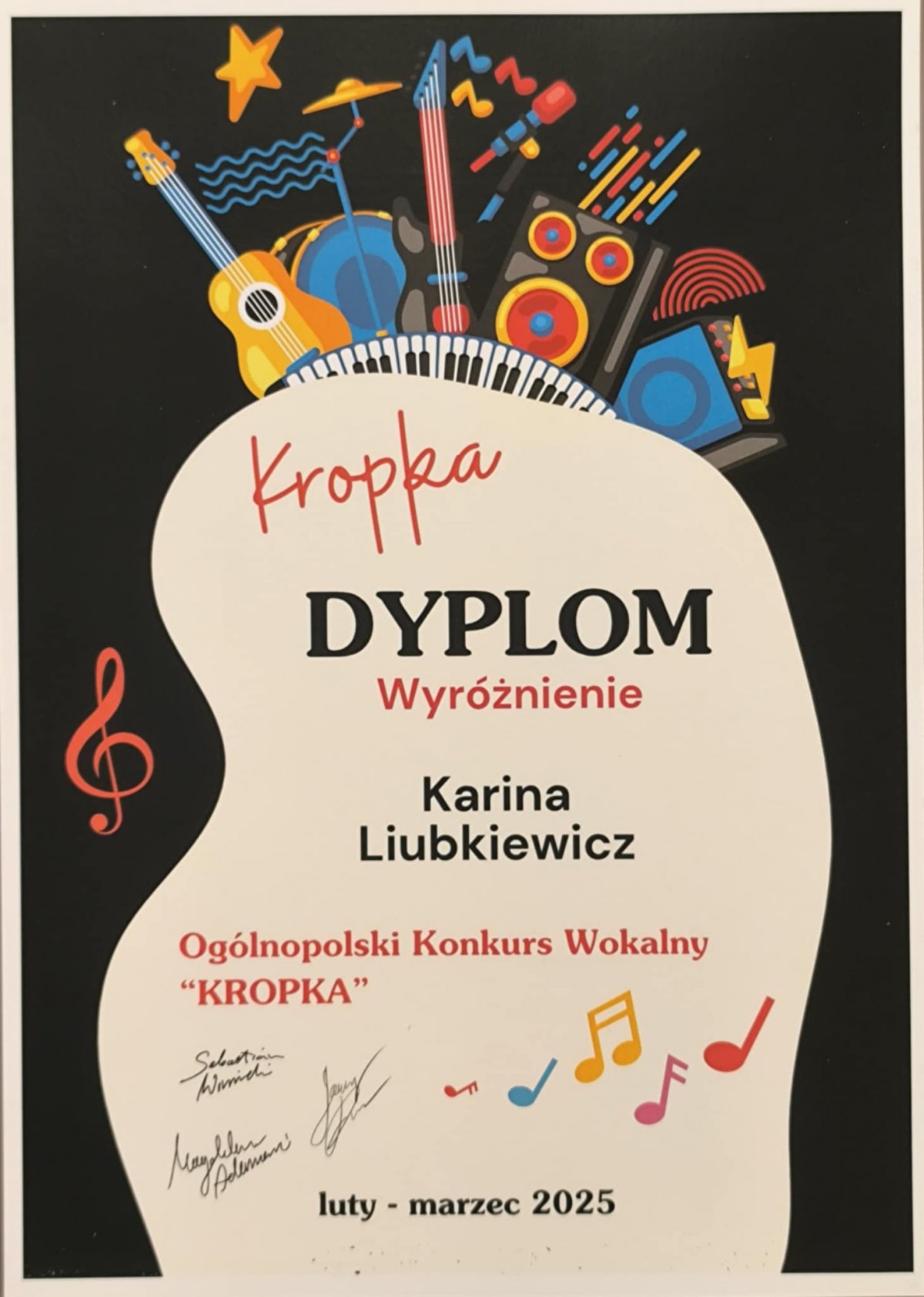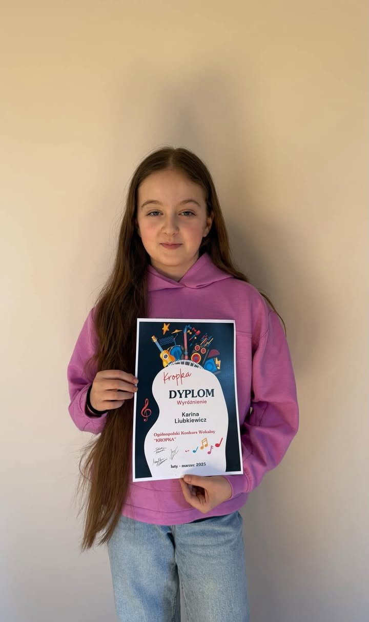 Uczennica 6a kl. naszego gimnazjum Karina Liubkiewicz uczestniczyła w III Ogólnopolskim konkursie wokalnym "Kropka" 2025 online. W swojej kategorii wiekowej 12 – 13 lat zdobyła WYRÓŻNIENIE.