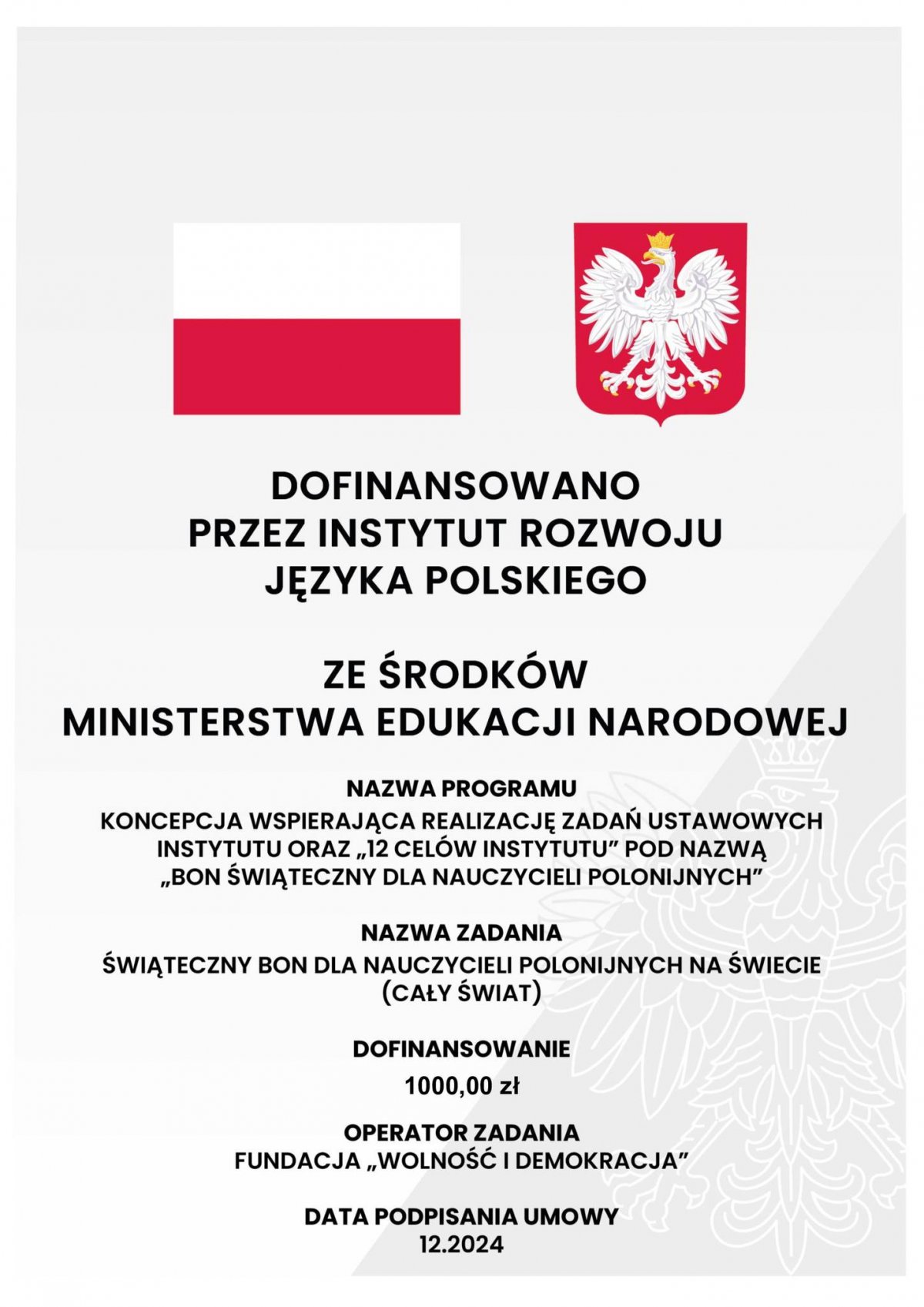 Bon świąteczny dla nauczycieli polonijnych jest finansowany przez Instytut Rozwoju Języka Polskiego im. Św. Maksymiliana Marii Kolbego ze środków Ministerstwa Edukacji Narodowej, realizowany przez "Fundacja Wolność i Demokracja".