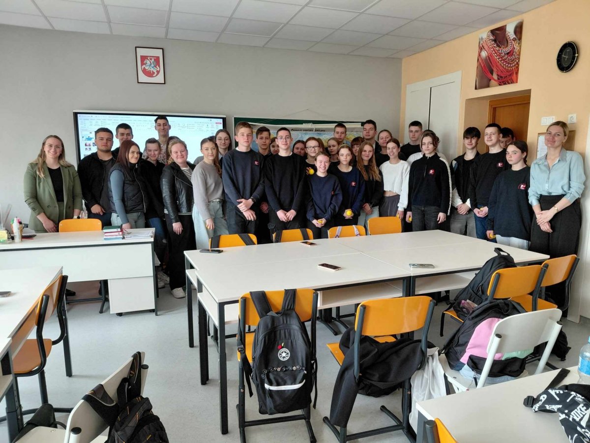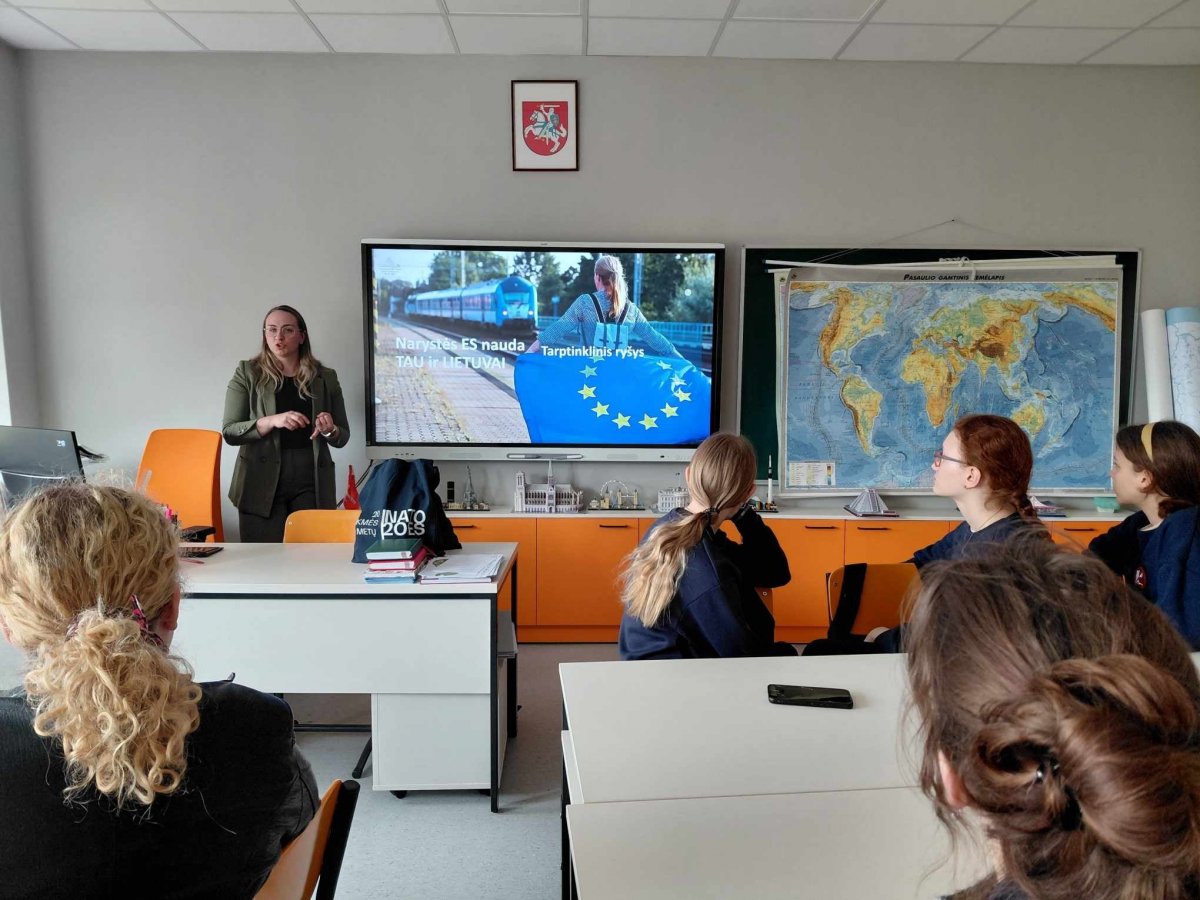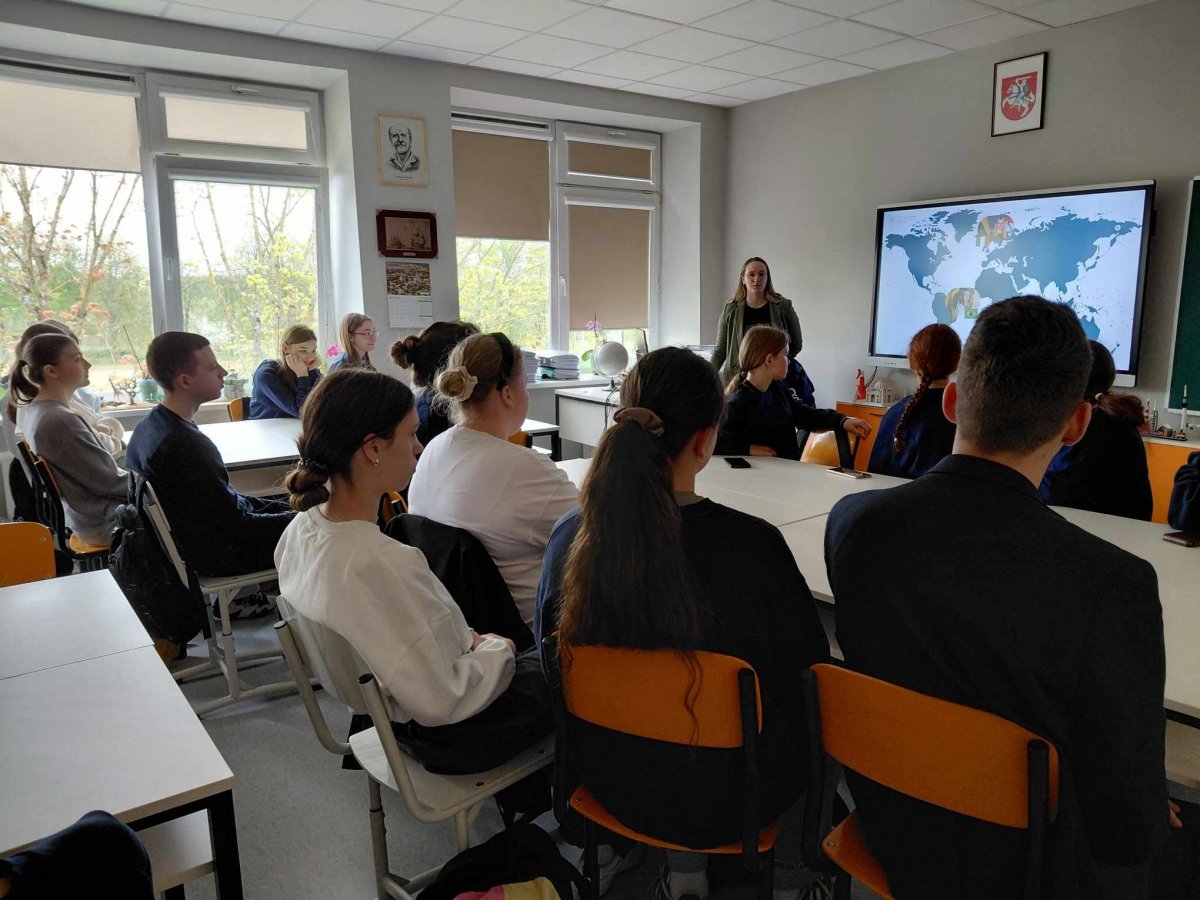 Susitikimo metu, I-IV-ų gimnazijos klasių mokiniai, susipažino su Lietuvos diplomatinių atstovybių veikla, buvo kalbėta apie šiandieninės demokratijos iššūkius Europos Sąjungoje bei už jos ribų. Viešnios mokiniams priminė kaip veikia pagrindinės Europos Sąjungos institucijos, kas joms vadovauja, kaip priimami sprendimai ES. Pamokos pabaigoje mokiniai įsivertino savo žinias dalyvaudami smagioje viktorinoje, už dalyvavimą joje visi dalyviai buvo apdovanoti.