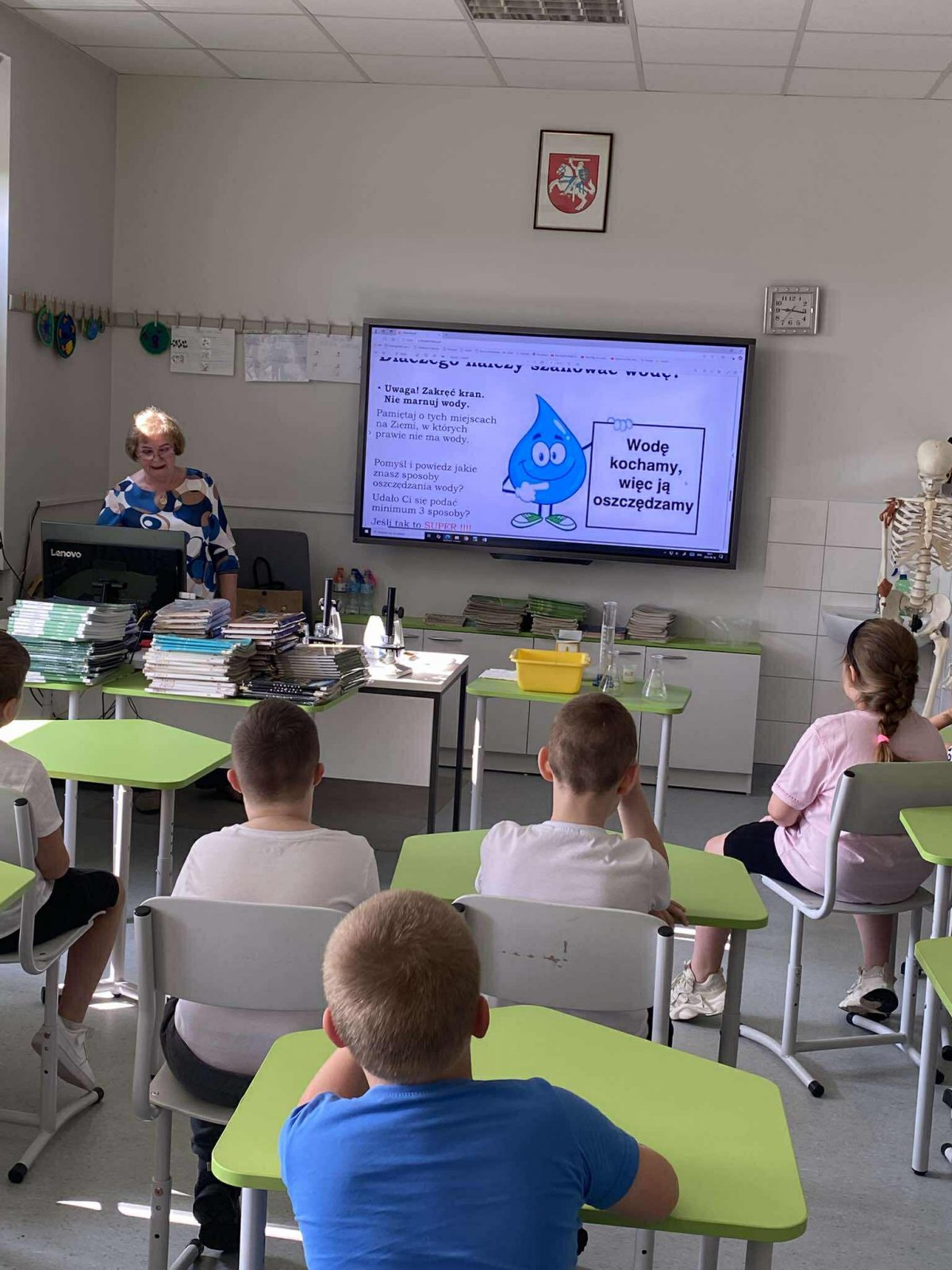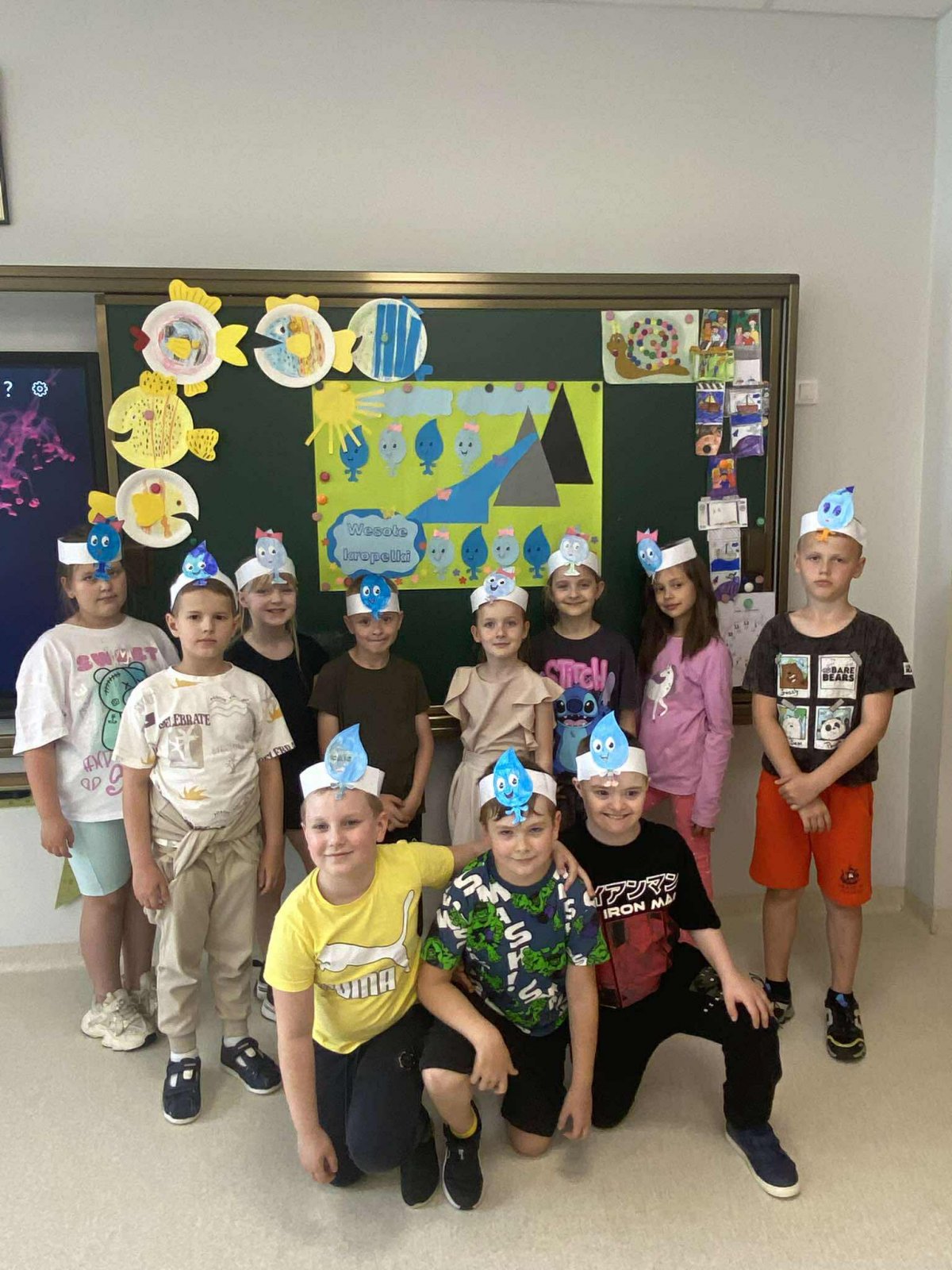 1-2 klasy miały zajęcia pt. „Wędrówka kropelki wody’’ z nauczycielką biologii p. Teresą Balińską. Dzieci dowiedziały się m.in. dlaczego należy szanować wodę, czy woda jest dostępna dla każdego człowieka? Pani Teresa pokazała również ciekawe eksperymenty.