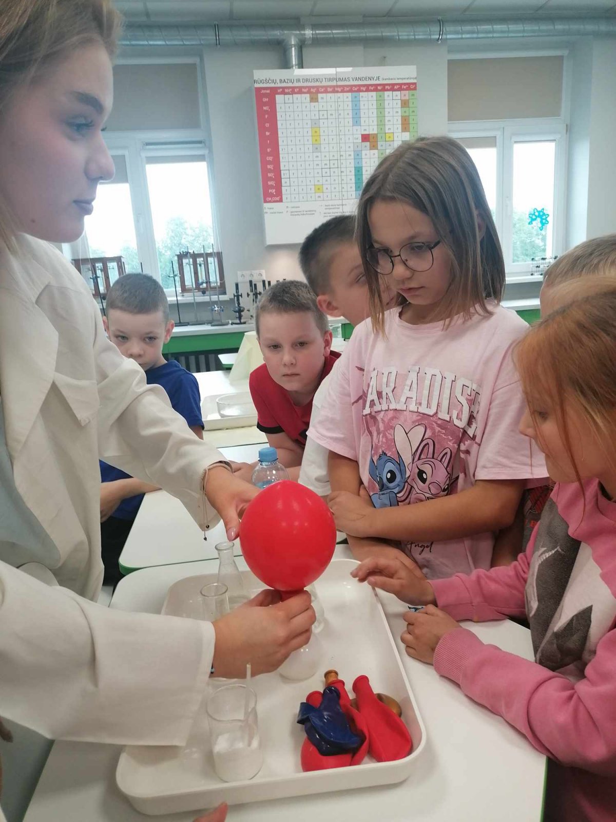 Odwiedziliśmy również pracownię fizyki. Pani Regina Niekrewicz, nauczycielka fizyki opowiedziała, czego uczy ten przedmiot oraz przygotowała ciekawe zajęcia dla dzieci. To były doświadczenia i eksperymenty. Pod kierunkiem starszych kolegów oraz pani od fizyki dzieci wykonały doświadczenia. Każde doświadczenie fizyczne pomoże najmłodszym zrozumieć otaczający je świat i odpowiedzieć na wiele pytań.