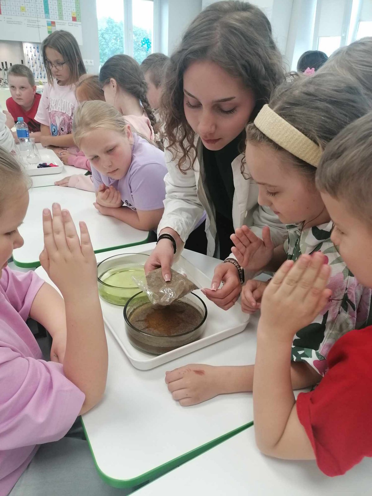 Niesamowitą przygodę z wodą, jako mali badacze, mieliśmy w laboratorium chemicznym. Woda, która jest wszędzie wokół nas, kryje niesamowite tajemnice i potrafi zachowywać się w zadziwiający sposób. Nauczycielka chemii pani Anna Cimosz zaprezentowała ciekawe eksperymenty pt. ,,Co kryje w sobie woda?’’, które były nie tylko świetną zabawą, ale także zapoznały nas z takimi zasadami jak gęstość, napięcie powierzchniowe, mieszalność. Była to tęczowa woda, chodząca woda z barwnikami, latające balony, eksperymenty z olejem oraz wiele innych, ciekawych rzeczy.