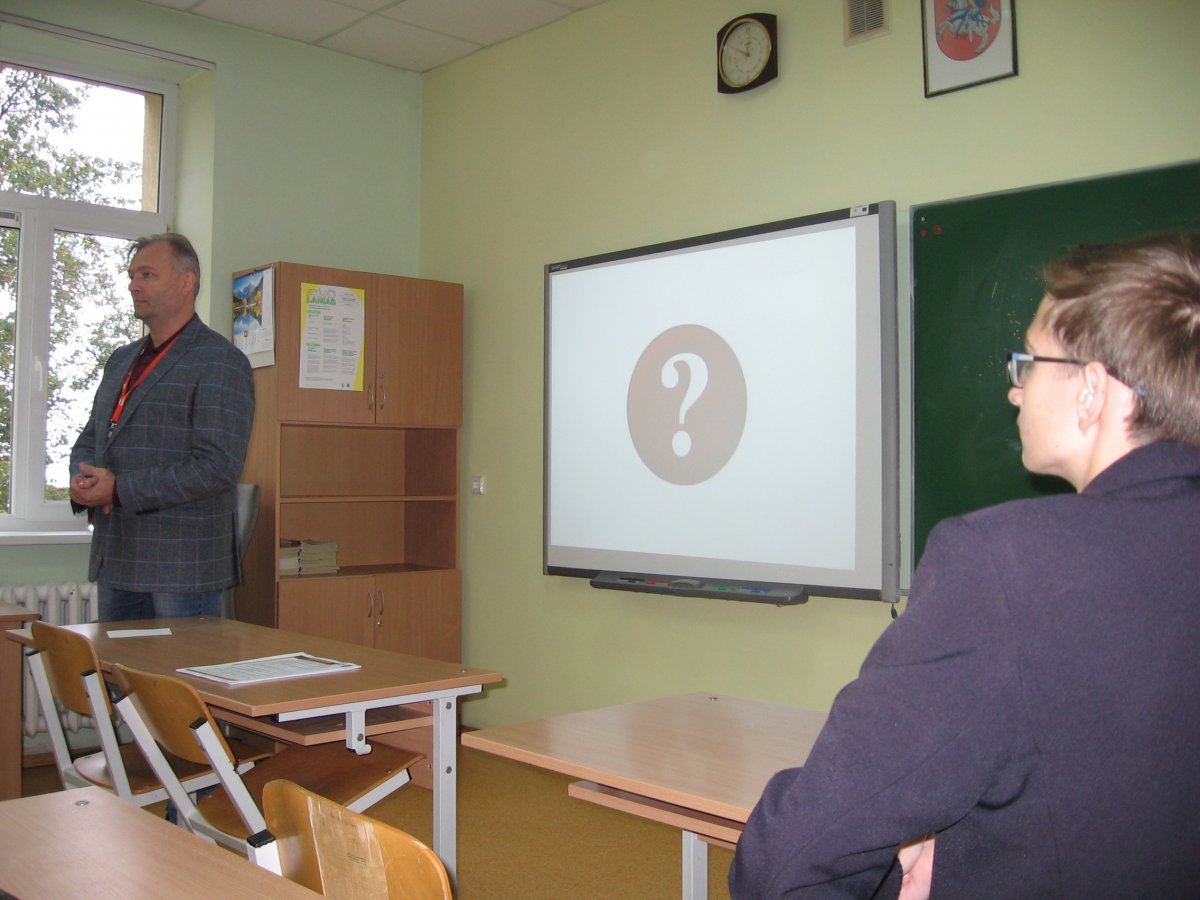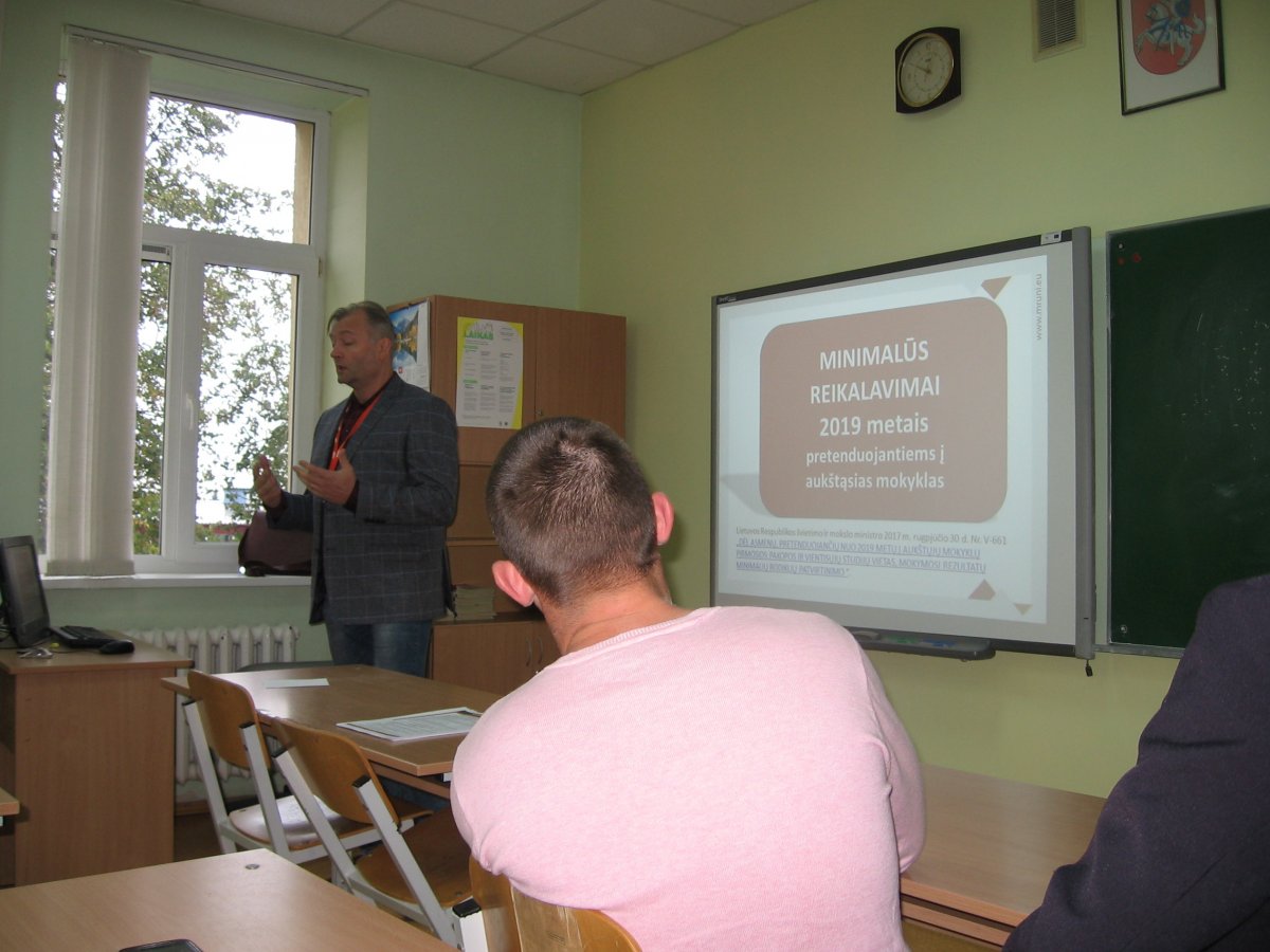 Šių metų spalio 3 dieną GIII – GIV klasių mokiniai susitiko su MRU Komunikacijos ir rinkodaros vadovu S. Bugailiškiu. Savo pokalbį jis pradėjo labai aktualiu kiekvienam žmogui klausimus: „Ar jau žinote kur stosite, ką studijuosite?“