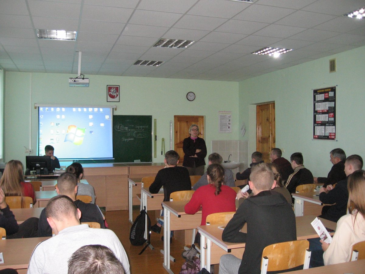 Gruodžio 11 d. mūsų gimnazijoje svečiavosi Balstogės universiteto Vilniaus filialo atstovai. Susitikime dalyvavę IV G klasės mokiniai turėjo puikią progą susipažinti su universiteto teikiama studijų programa, galimybėmis studijuoti Lietuvoje ir Lenkijoje, populiariomis specialybėmis ir finansavimo klausimais. Pasak universiteto atstovų, dabar pačios populiariausios yra ekonomikos, informatikos, Europos teisės studijos. Viešnia papasakojo apie tai, kad universitete yra daug papildomos veiklos: veikia sporto, muzikos, dailės būreliai.
