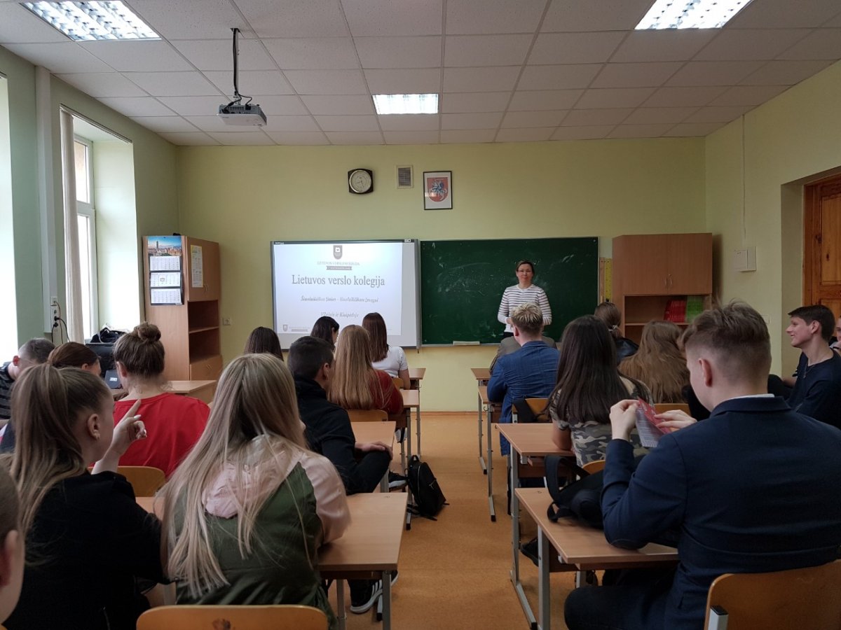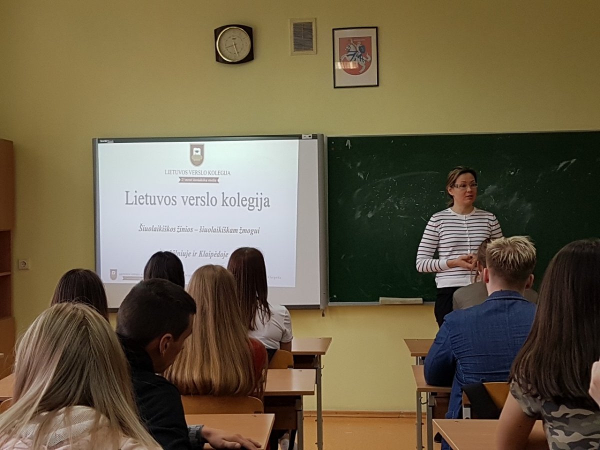 2019-04-11 mūsų gimnazijoje viešėjo Lietuvos verslo kolegijos padalinio vadovė Renata Skrebutėnienė. Ji mokiniams pristatė stojimo į kolegiją tvarką, studijų programas bei studijavimo užsienyje galimybes. Kolegija yra įsikūrusi Mykolo Romerio universitete, glaudžiai bendradarbiauja su šiuo universitetu bei suteikia puikias galimybes tęsti magistratūros studijas jame. Mokiniai įdėmiai klausėsi, vėliau aktyviai dalyvavo klausimų viktorinoje.