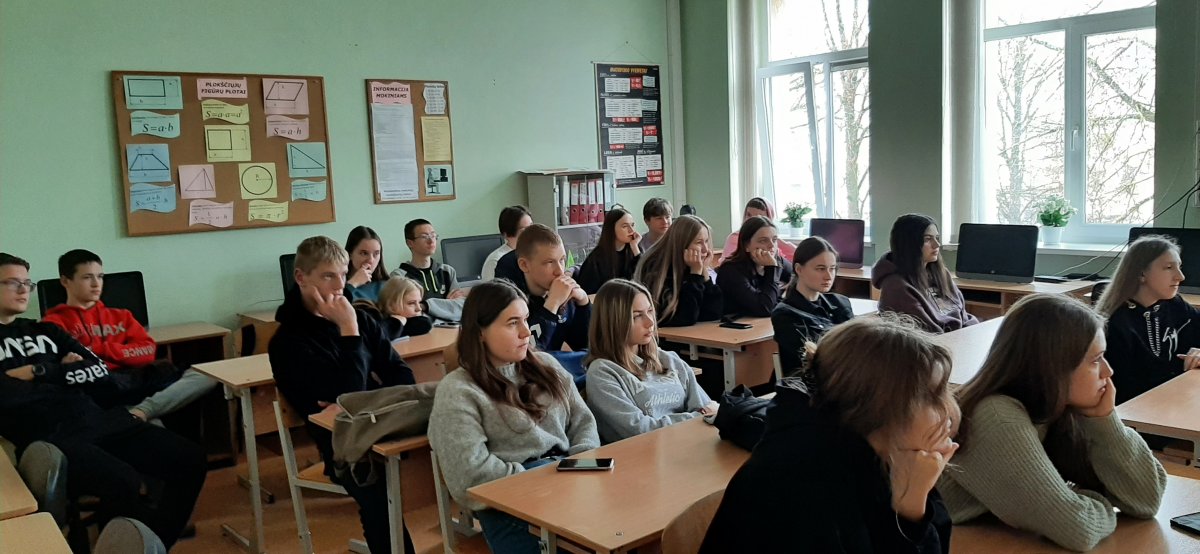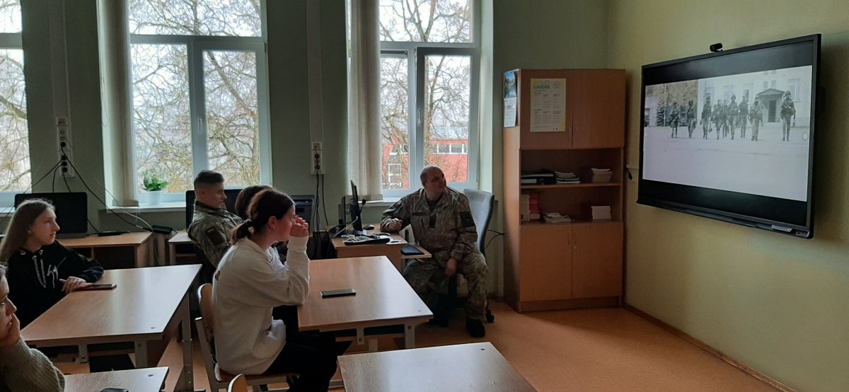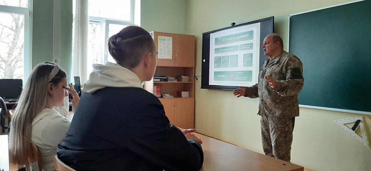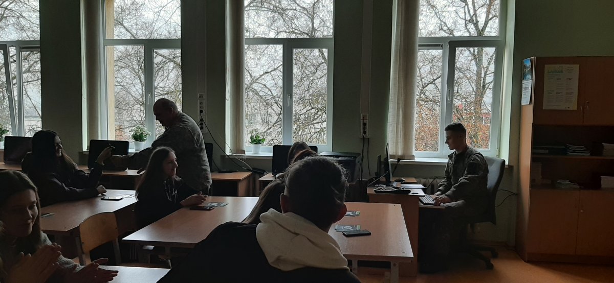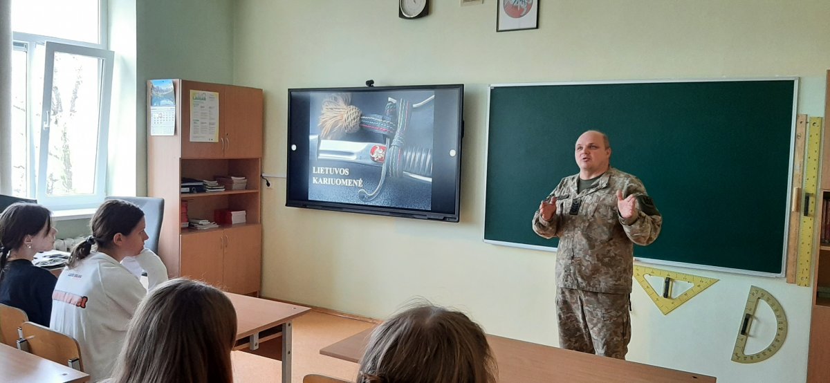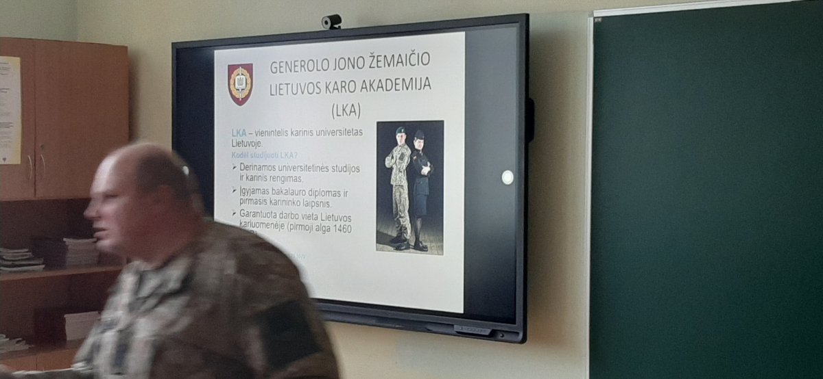 Šių metų lapkričio 8 d. GIV kl. mokiniai susitiko su viršila Eimantu Tamulynu.Susitikimo metu vrš. Eimantas Tamulynas įdomiai ir išsamiai supažindino moksleivius su karjeros galimybėmis Lietuvos kariuomenėje, kokie privalumai ne tik kariuomenėje, bet ir gyvenime įgyjami tarnaujant. Susitikimo metu kariai skatino moksleivius domėtis Lietuvos kariuomene, jos istorija. Moksleiviai pateikė įvairių, juos dominančių klausimų, diskutavo apie stojimo į kariuomenę sąlygas. Širdingai dėkojame gerb. Eimantui Tamulynui už mokinių profesinį informavimą.