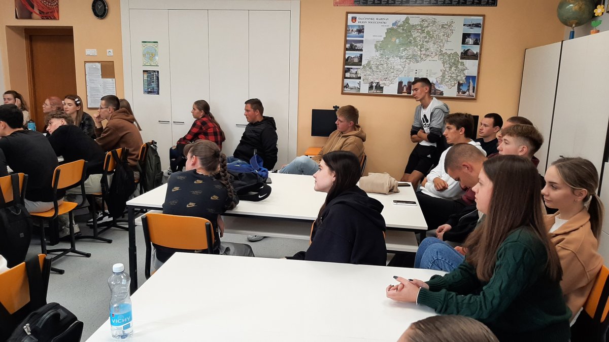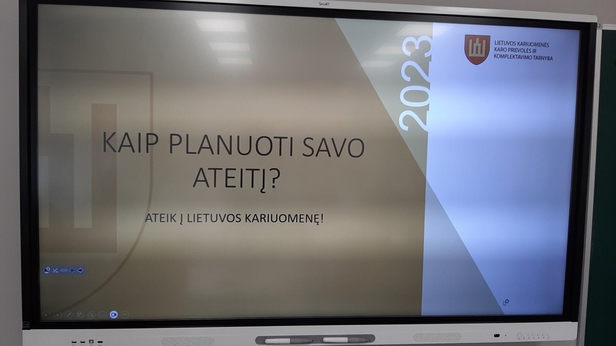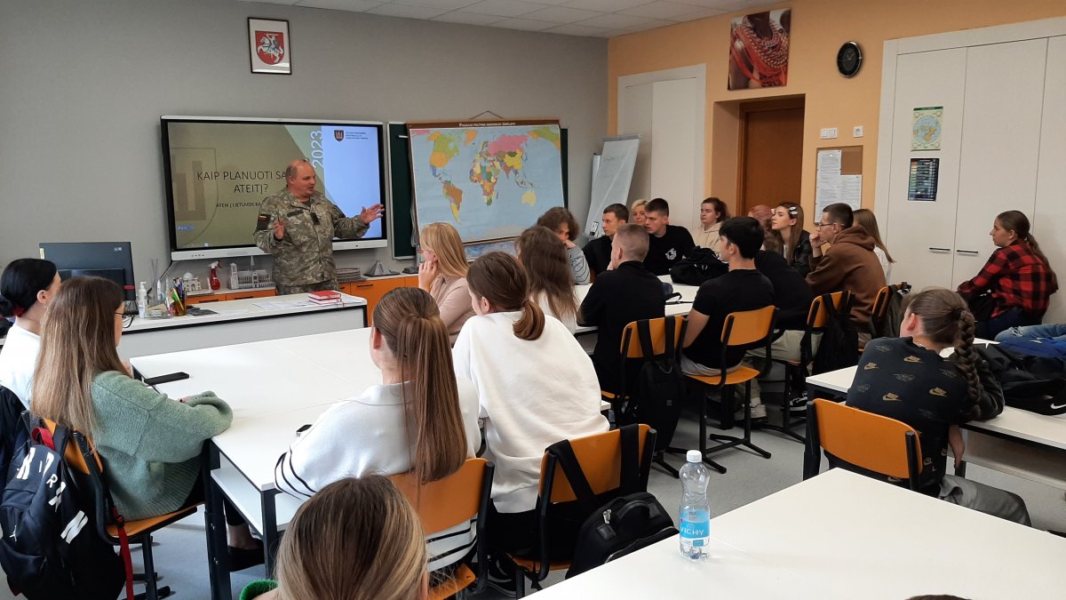 Spalio 3 d. IVG klasių mokiniai dalyvavo susitikime su viršila Eimantu Tamulynu. Susitikimo metu vrš. E. Tamulynas supažindino moksleivius net su 4 karinės tarnybos būdais: nuolatine privalomąja pradine karo tarnyba, kario savanorio tarnyba, jaunesniųjų karininkų vadų mokymais, profesine karo tarnyba. Įvardintos socialinės garantijos bei galimybė derinti tarnybą su aukštuoju mokslu paskatino abiturientus plačiau pasidomėti kario profesija.