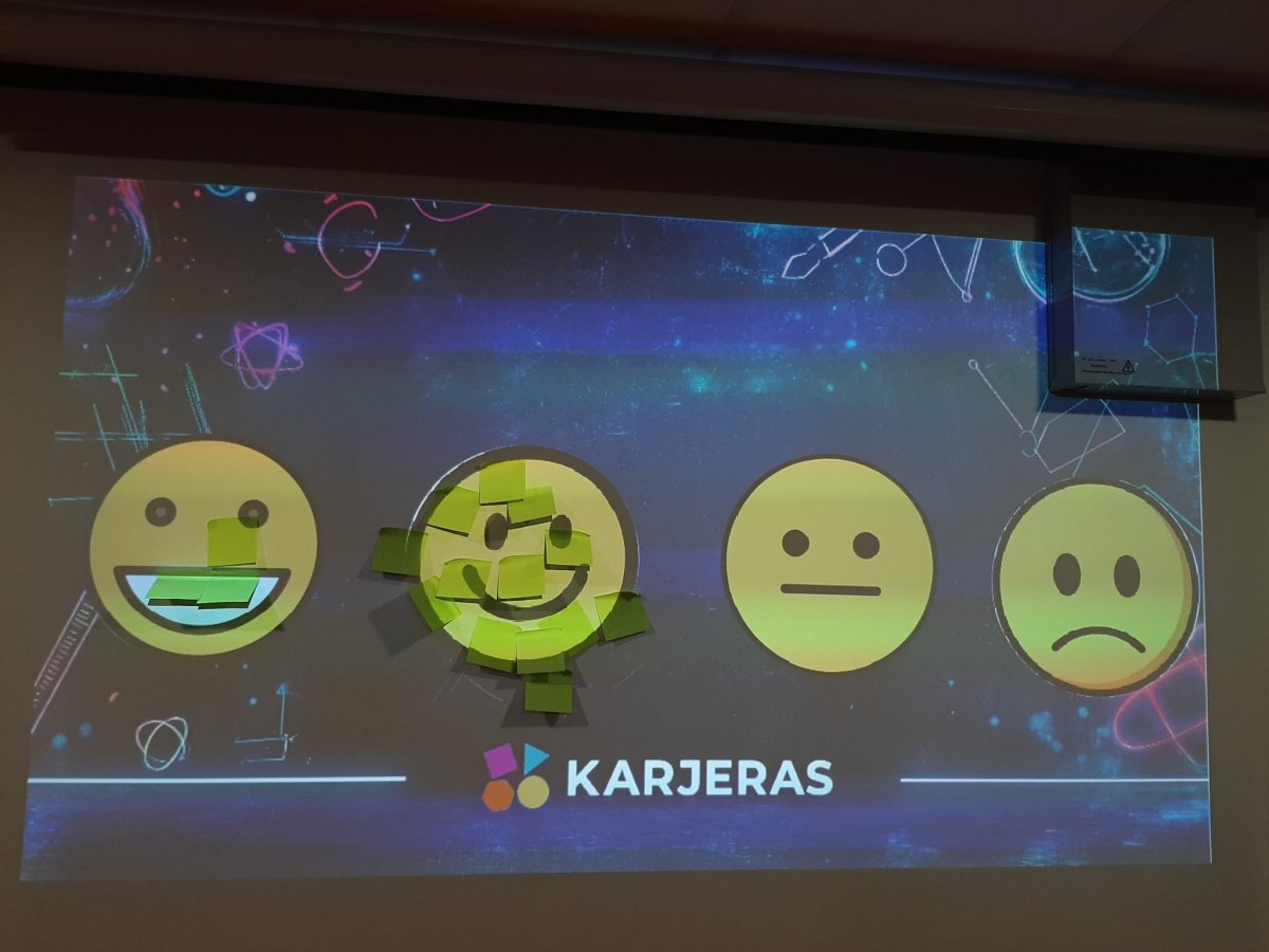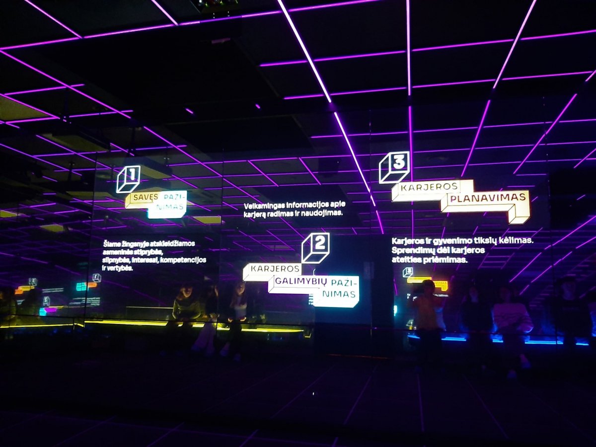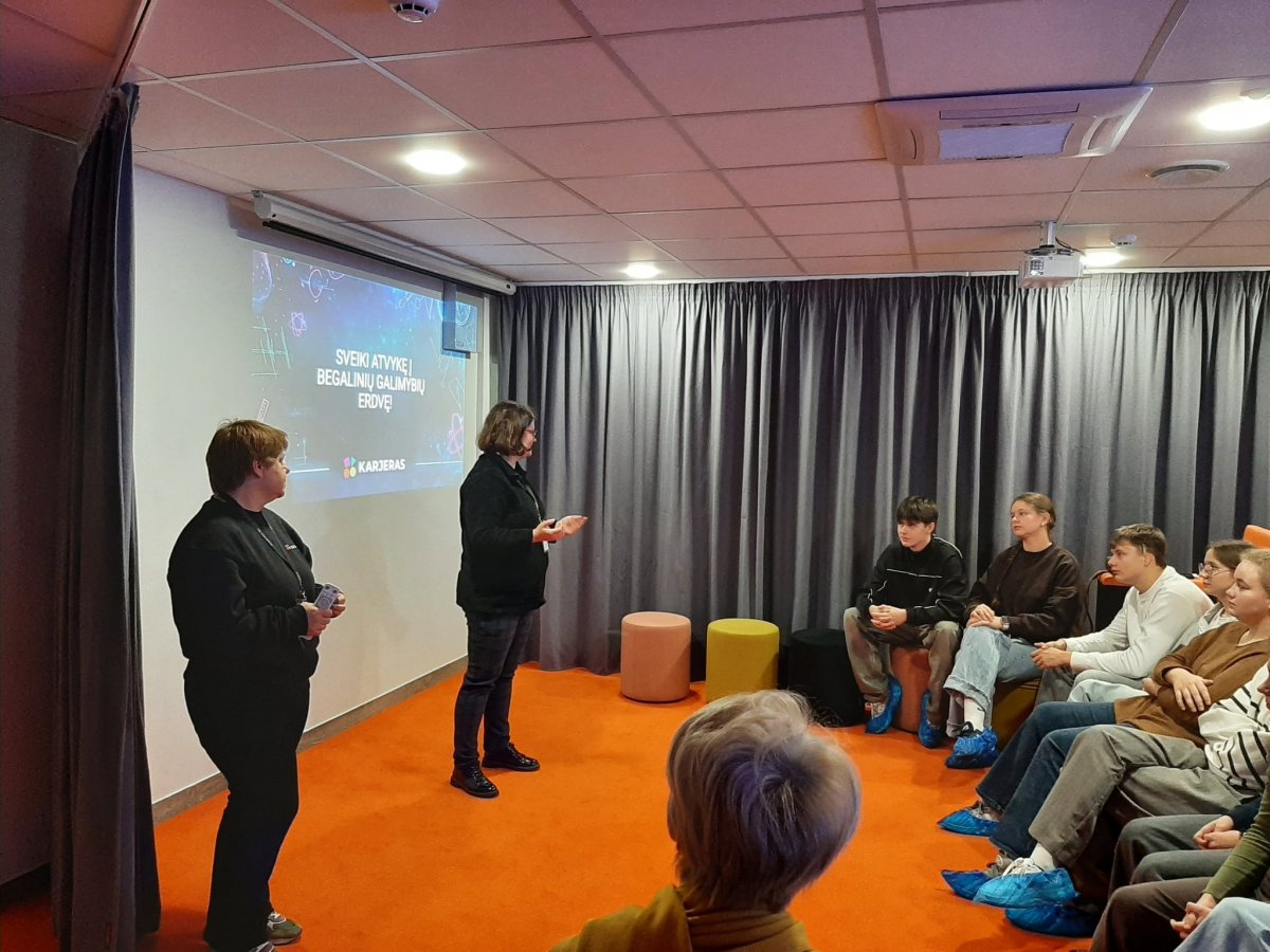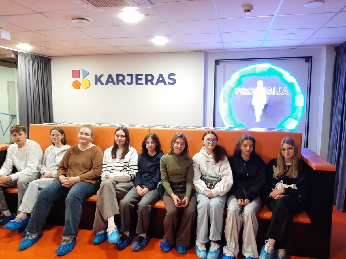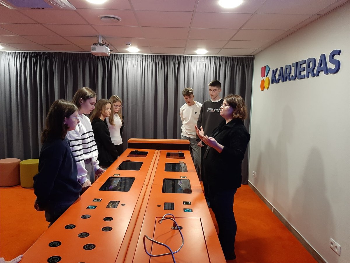 Spalio 30 d. mūsų gimnazijos IIG kl. mokiniai lankėsi Skaitmeniniame karjeros centre „KARJERAS“ Vilniuje – modernioje erdvėje, skirtoje jaunimui, siekiančiam geriau pažinti technologijų pasaulį ir atrasti savo kelią jame. Vizito metu gimnazistai dalyvavo interaktyviose dirbtuvėse, be to, dalyviai atliko gebėjimų ir polinkių testus, padedančius geriau suprasti savo stipriąsias puses bei galimas ateities profesijų kryptis. Konsultantai individualiai aptarė testų rezultatus, patarė, kokios studijų kryptys ar profesijos galėtų labiausiai tikti kiekvienam mokiniui. Įdomiausia veiklos dalis – simuliacinis darbo pokalbis, kurio metu gimnazistai galėjo pasijusti tikrais kandidatais į darbo vietą. Ši praktinė patirtis leido geriau suprasti, kaip pasiruošti darbo pokalbiui, kokių klausimų galima sulaukti ir kaip tinkamai pristatyti save.